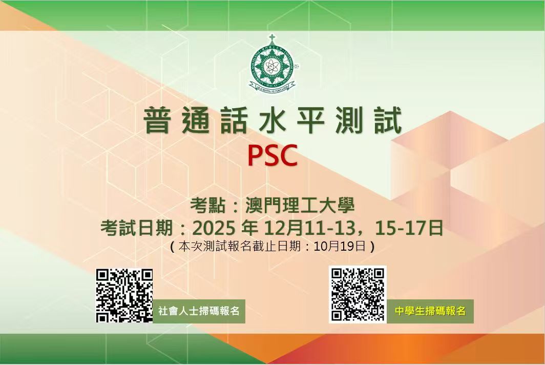 澳門理工大學與國家語言文字工作委員會(國家語委)合作開展的普通話水平測試(PSC)現已啟動2025年12月考期的報名工作,此次測試將於12月11至13日、15至17日舉行,歡迎社會各界人士踴躍報名參加測試,本次測試報名截止日期為10月19日。