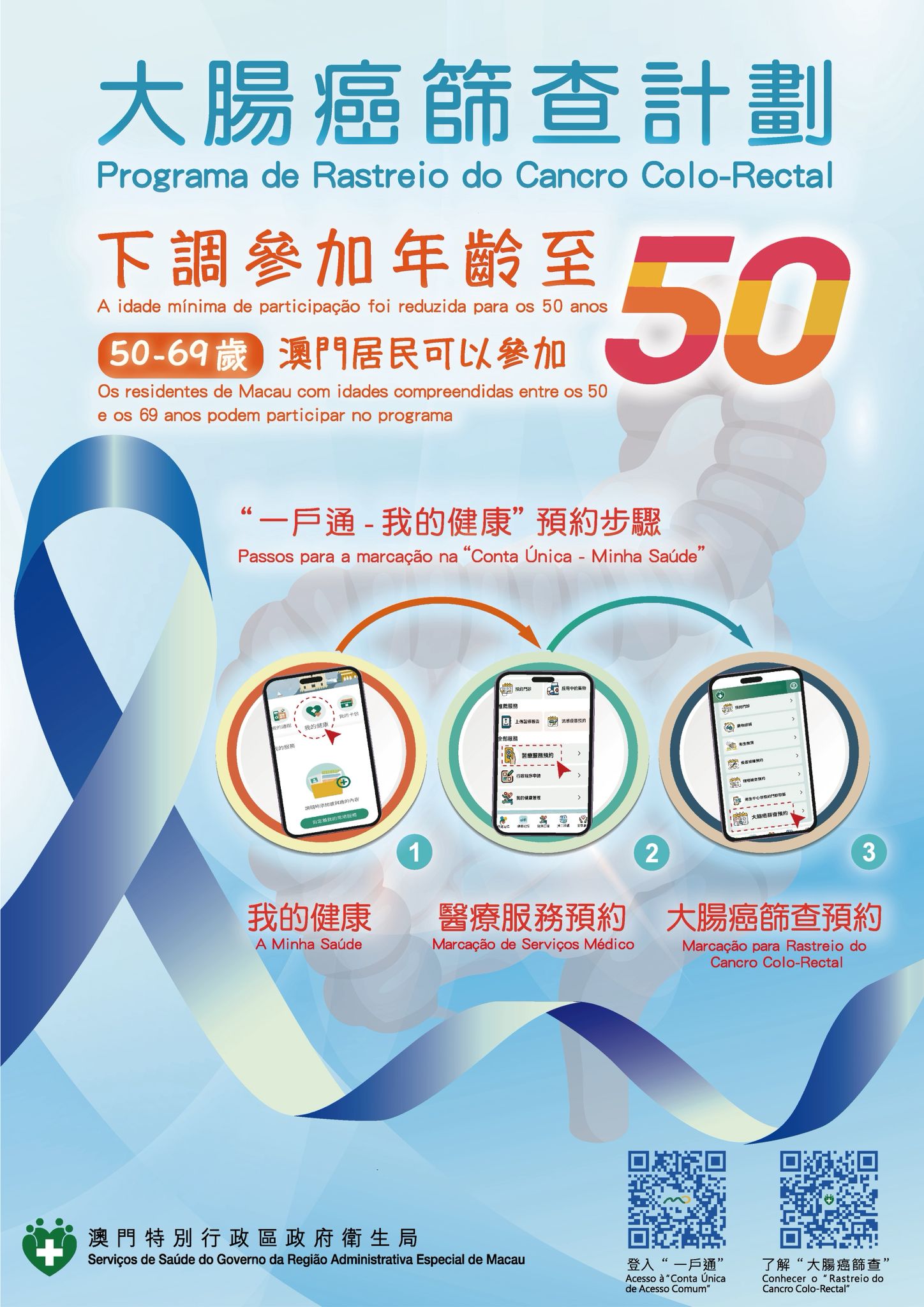 大腸癌篩查方面,該計劃自2016年11月起推行至今年9月中旬累計已為超過37,000人次提供篩查服務,成功識別出337例高危息肉及179例惡性腫瘤,其中大多數確診個案屬於早期癌症階段,顯示篩查計劃能有效預防大腸癌的發生並有效把握了治療的黃金時期。現時50至69歲、過去5年內未曾接受大腸鏡檢查、過去2年內未進行大便潛血檢查,且無大腸癌病史本澳居民可預約篩查。