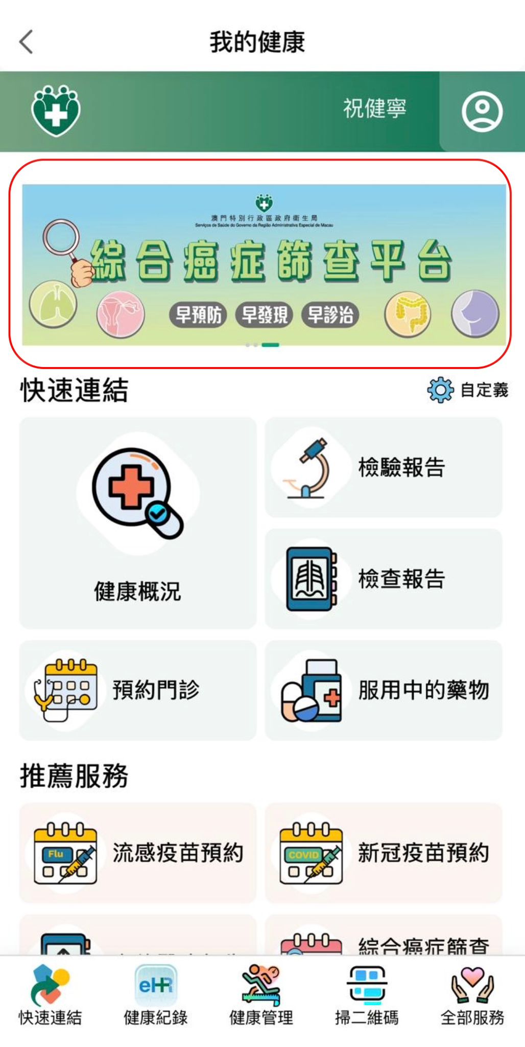 癌症是由多種原因引起的慢性病,與遺傳、環境以及生活習慣等因素有關。世界衛生組織指出,三分之一癌症可透過實踐健康生活模式和減少接觸致癌因子來預防。為貫徹落實《健康澳門藍圖》所訂定的總體目標和各項指標,衛生局積極推行癌症的篩查工作,以達致“早預防、早發現、早診治”,提高患者治癒機率的目的,自明(9)日起在“一戶通” “我的健康”內推出“綜合癌症篩查平台”,系統會根據居民的性別、年齡和問卷評估結果等資料,建議居民預約相應的癌症篩查服務,居民可在“平台”實現一站式預約子宮頸癌、大腸癌、乳腺癌和肺癌等主要癌症篩查服務及獲取更多相關資訊。