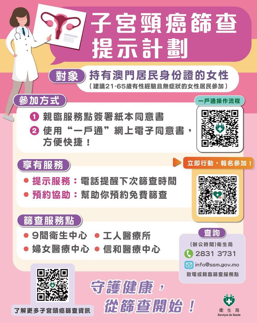 值得指出的是,癌症防治是一項長期而艱巨的任務,透過特區政府引領、社團機構協作、全體居民共同參與和努力,澳門有望進一步控制癌症發病率和降低死亡率,讓居民更健康。在子宮頸癌篩查方面,衛生局早於40年前開始推行相關工作並逐步擴展,至2009年與非牟利機構合作,將免費篩查服務擴展至全澳居民。今年3月與非牟利機構合作開展“子宮頸癌篩查提示計劃”,由工作人員致電提醒及協助參加者預約篩查;今年5月與婦女聯合總會合作在“一戶通”增加“子宮頸癌篩查快速通道” 預約。此外,衛生局正推行“HPV自採先導計劃”,引入世界衛生組織推薦的新型篩查方式,讓居民可在家中自行採樣,現階段收集相關數據進行分析,為未來計劃奠定數據基礎。衛生局建議,有性經驗的女性自21歲起需定期接受篩查,且持續至65歲。