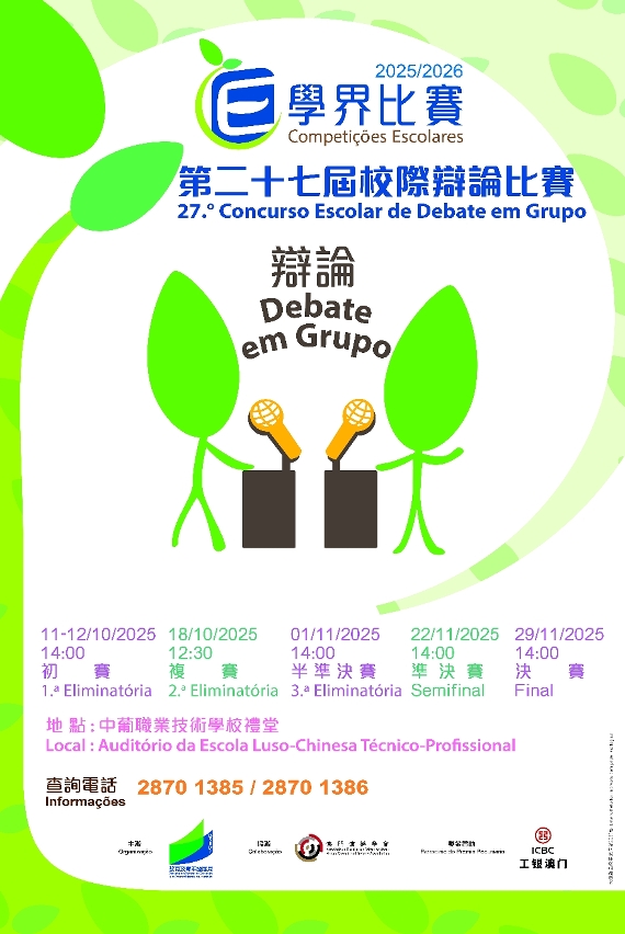 為培養學生的分析和邏輯思維能力,訓練其語言表達能力和技巧,由教育及青年發展局主辦、澳門演辯學會協辦、中國工商銀行(澳門)股份有限公司獎金贊助的2025/2026學年“第二十七屆校際辯論比賽”將於2025年10月至11月期間假中葡職業技術學校禮堂舉行。