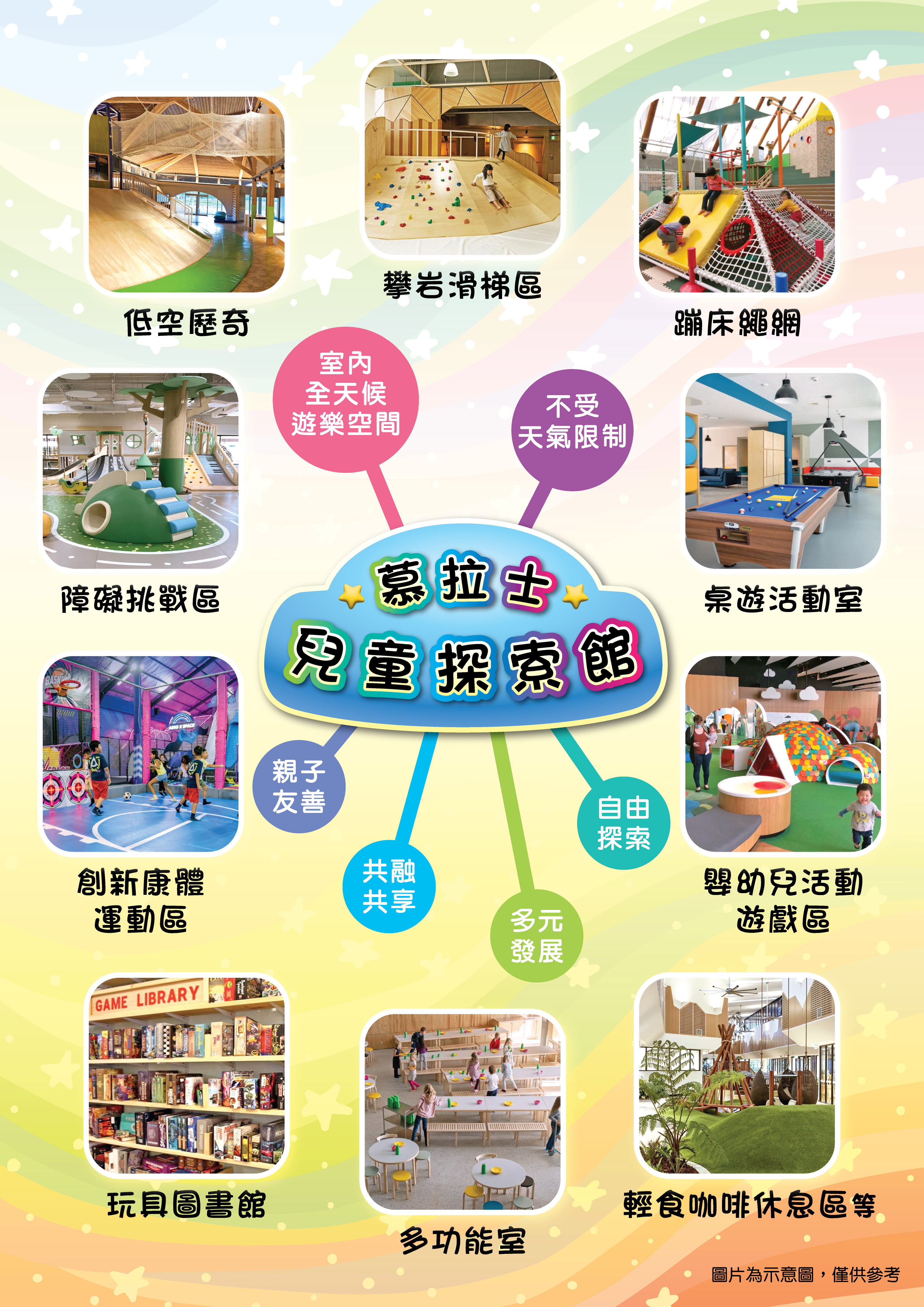 一樓總面積約3,000平方米,計劃分六大區塊,遊戲設施對象年齡段為0至12歲,計劃設施包括低空歷奇、攀岩滑梯區、爬網、滑梯障礙挑戰區、嬰幼兒活動遊戲區、工作坊、多功能室、桌遊室、玩具圖書館及輕食咖啡休息區。二樓總面積約3,500平方米,計劃分五大區塊,遊戲設施對象年齡段為6至18歲,設施包括蹦床樂園、探索網道、康體挑戰區、創新康體運動區及桌遊活動室等。