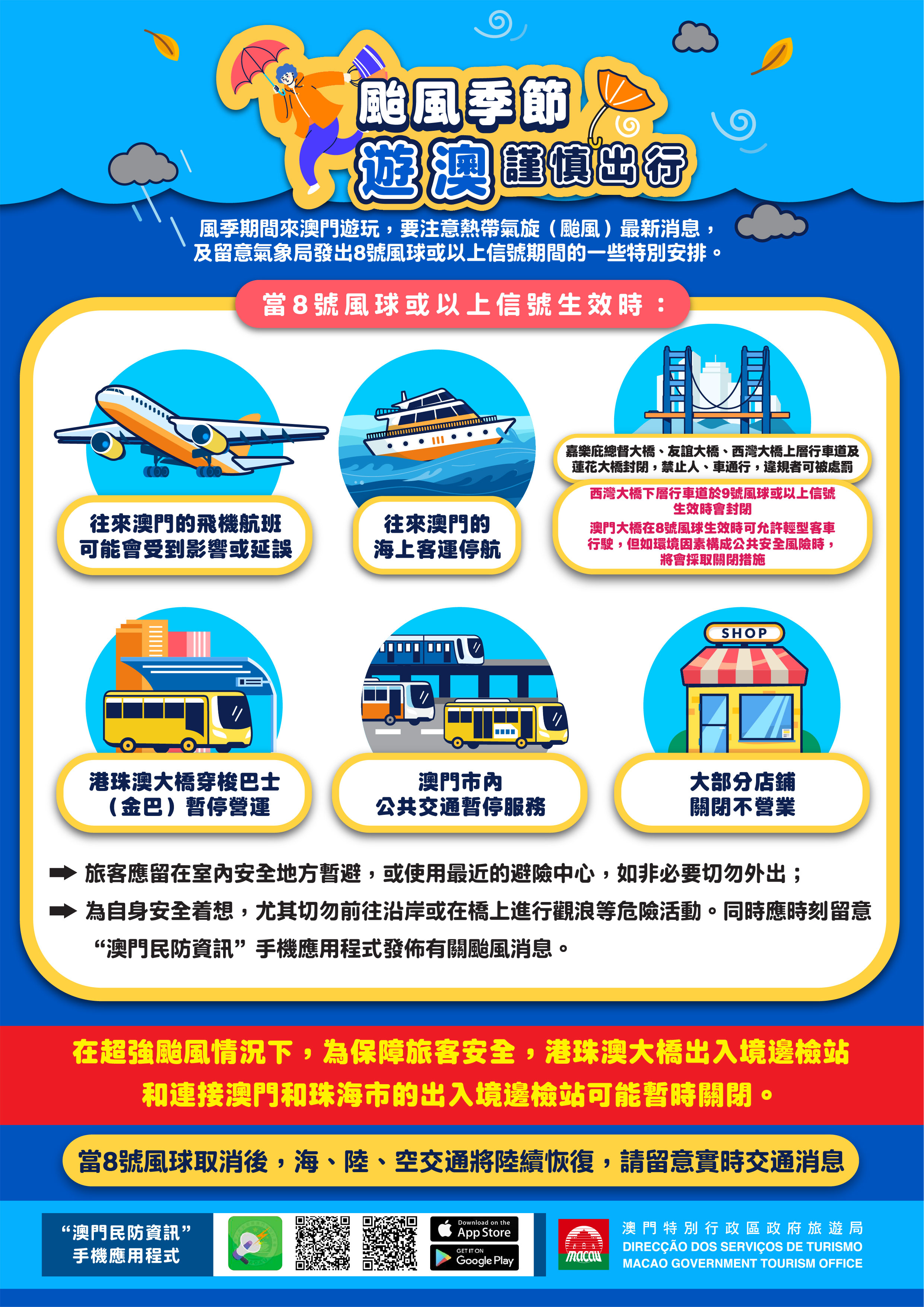 地球物理氣象局已發出3號風球。受熱帶氣旋影響,澳門風力將會增強,旅遊局建議旅客密切留意地球物理氣象局網站(www.smg.gov.mo/zh)及新聞局網站(www.gcs.gov.mo),以獲取最新資訊。