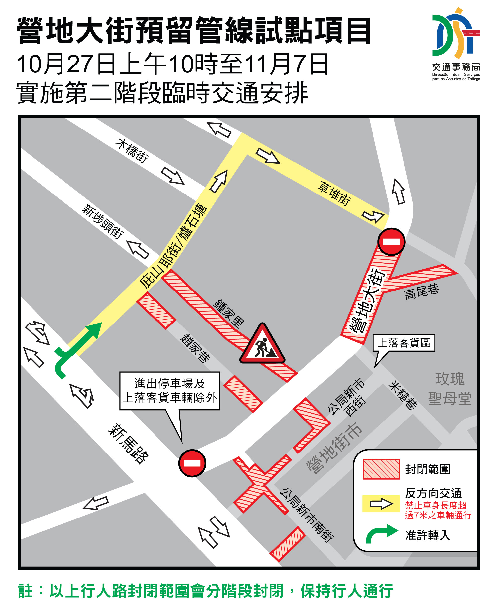 營地大街預留管線試點項目於10月9日開展,配合工程進程10月27日至11月7日將進行第二階段(預計合共12天工期),屆時米糙巷與草堆街之間的一段營地大街實施封閉交通,而米糙巷與新馬路的一段亦封閉並允許進出停車場及上落客貨車輛可經新馬路進出,另外,庇山耶街和草堆街的部份路段繼續維持反向行車,保持區內的交通循環。第二階段完成後,相關封閉交通措施將完成,第三階段(11月8日至11月27日)的施工範圍集中在區內內路,因此,原封閉交通和反方向行車的營地大街、草堆街和庇山耶街將於11月8日上午10時起恢復原有行車安排(具體可瀏覽https://www.dsat.gov.mo/dsat/news_detail.aspx?a_id=BFE531D406D9EF637E64B10A19E9E343 )。