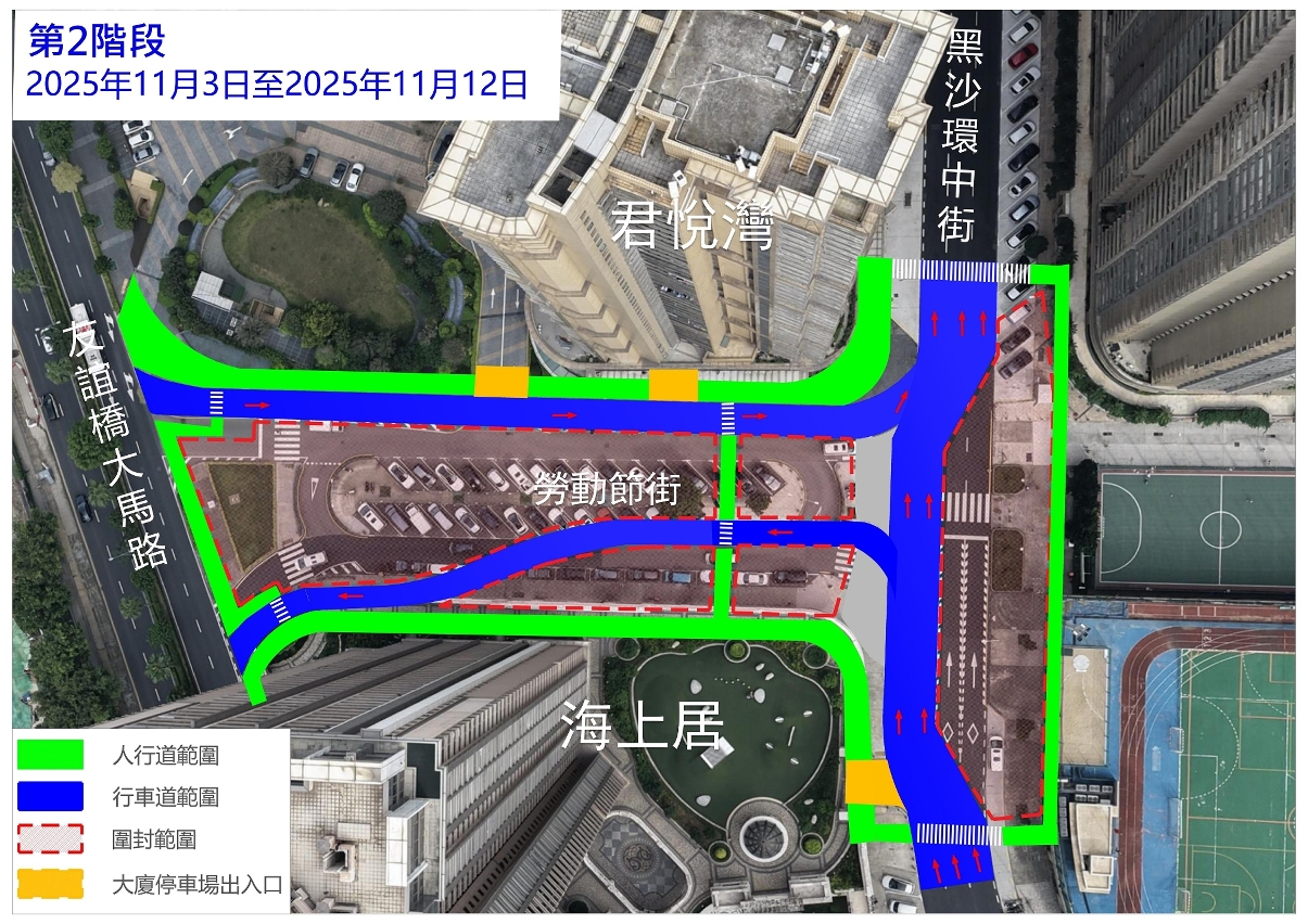 考慮到道路位處繁忙路段且施工時間較長,為減低工程對周邊交通的影響,經跨部門協調及與地區社團現場視察及聽取意見後,將採取分階段施工安排(詳見附表)。其中,第一、二階段由10月27日至11月12日,黑沙環中街部份路段將由原來三線行車改為兩線行車(詳見附圖);另外,配合本年大賽車活動,工程將透過調整工序,於賽事期間臨時恢復三線行車,以緩解賽車期間的交通壓力。
