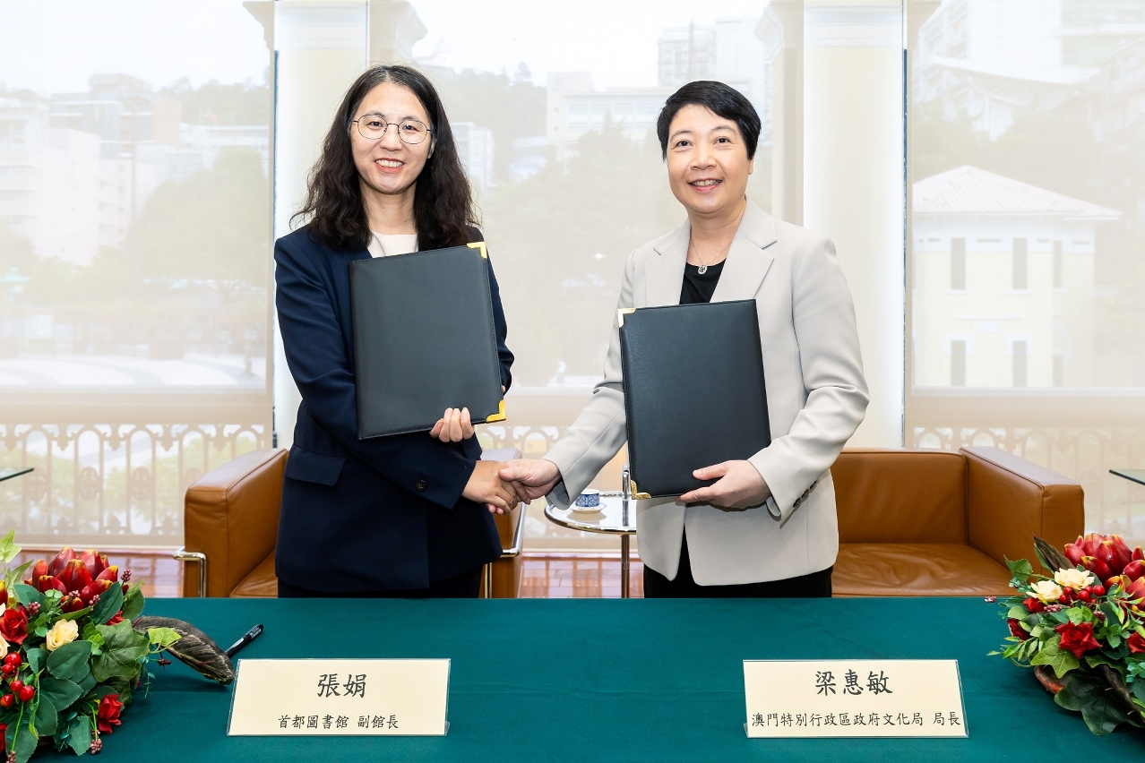 澳門特別行政區政府文化局與首都圖書館於10月24日在澳門文化局大樓簽署《首都圖書館與澳門特別行政區政府文化局合作協議》,由文化局局長梁惠敏與首都圖書館副館長張娟代表雙方簽署,標誌著兩地在公共圖書館領域的交流與合作邁入新階段。