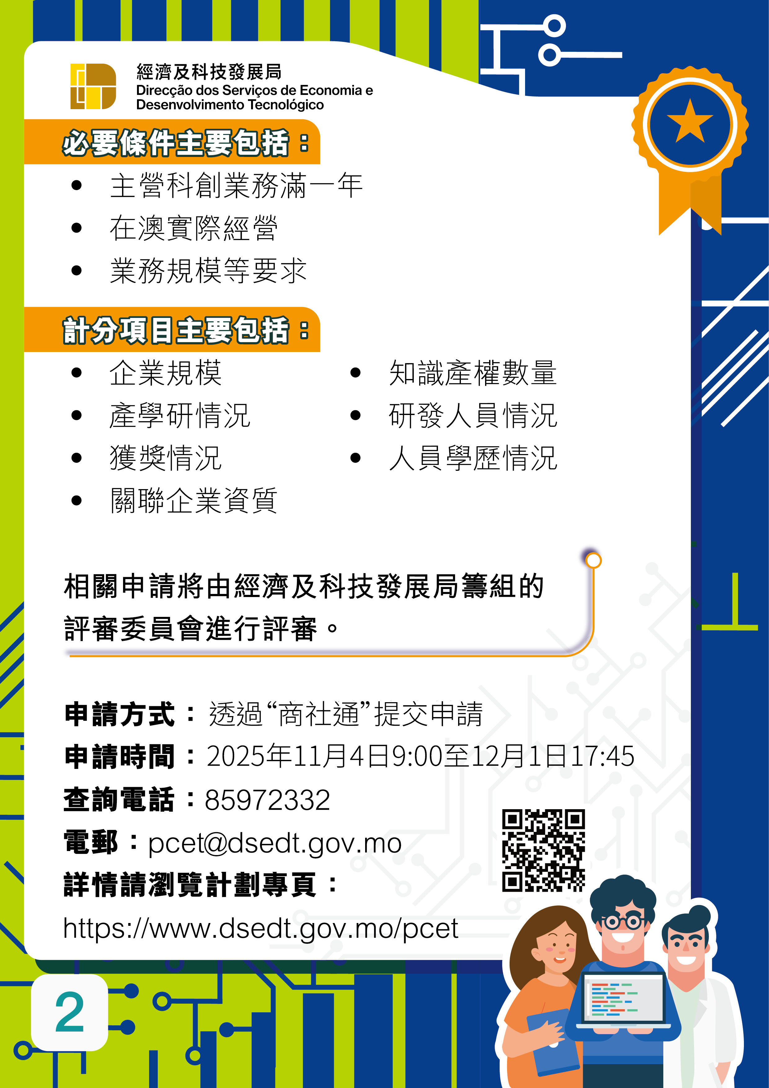 本輪申請期為2025年11月4日至12月1日,申請者可透過“商社通”平台的網上申請系統提交申請。對於獲認證的科技企業,特區政府已陸續在資金、人才及配對等多方面提供支援,有關申請詳情及相關的支援措施,可瀏覽計劃專頁(https://www.dsedt.gov.mo/pcet),或致電8597 2332查詢。
