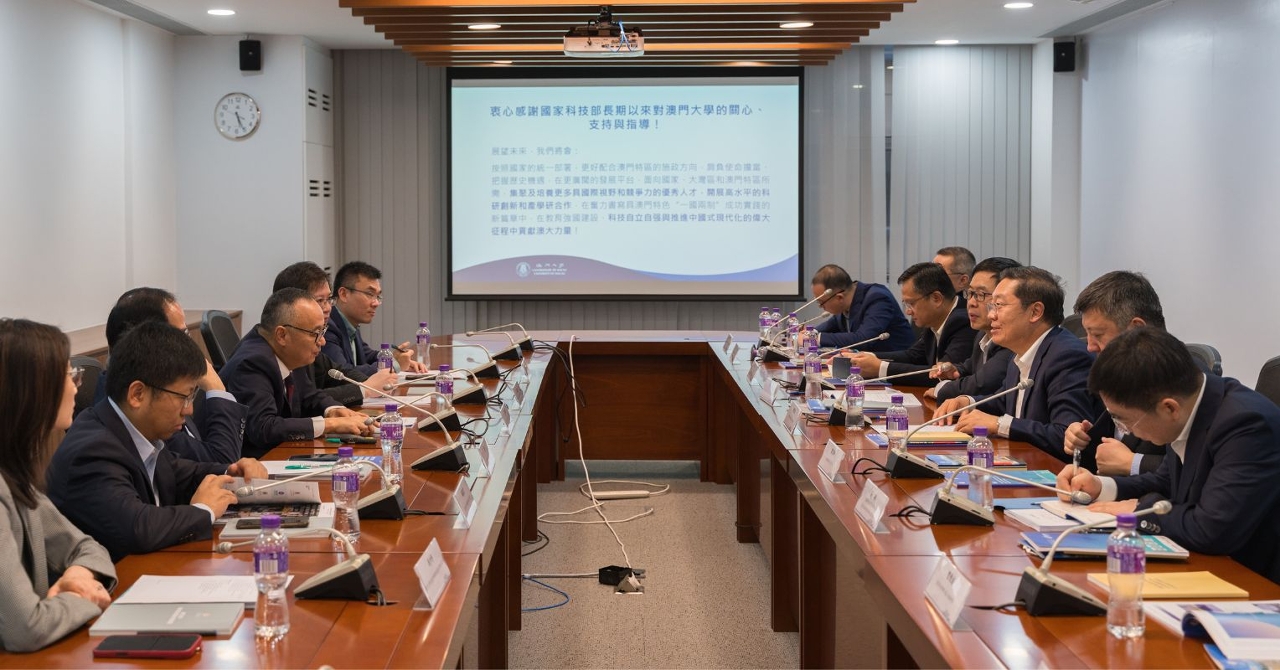 國家科技部副部長陳家昌率領代表團訪問澳門大學,獲澳大校長宋永華、副校長葛偉熱情接待,雙方就進一步加強內地與澳門的科技合作與交流進行深入探討。
