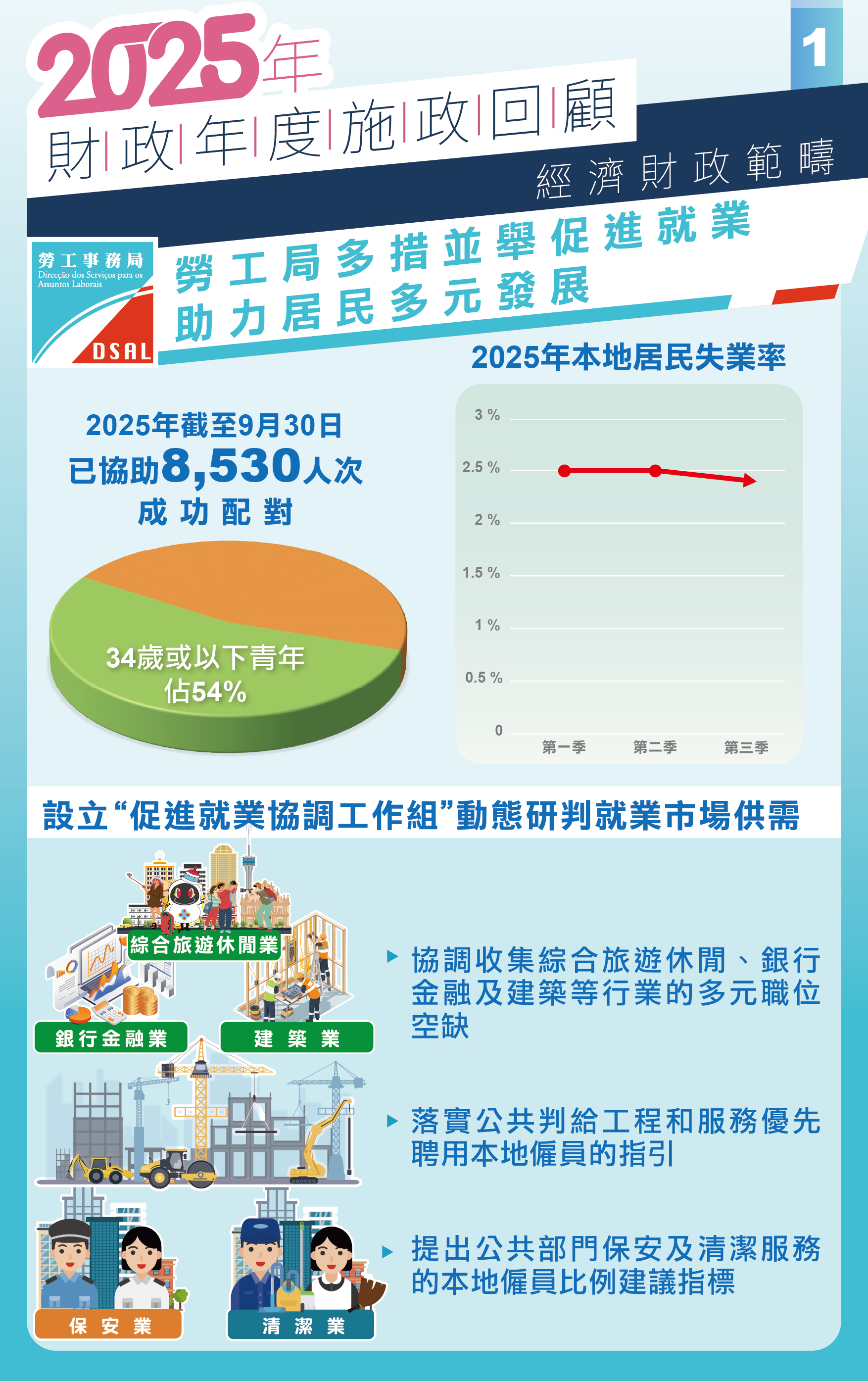 為落實2025年施政報告提出不斷改善居民就業狀況,並持續提升居民就業競爭力的目標,特區政府於今年5月成立“促進就業協調工作組”,科學統籌協調跨部門資源,並由勞工事務局(下稱“勞工局”)牽頭透過多元渠道做好就業配對工作,協助本地居民就業及多元發展。今年截至9月30日已協助8,530人次成功配對,其中34歲或以下青年佔54%,共4,582人次。2025年首兩季的本地居民失業率持續維持在2.5%,在畢業季的短期波動後,於第三季回落至2.4%,反映整體就業形勢穩定向好。