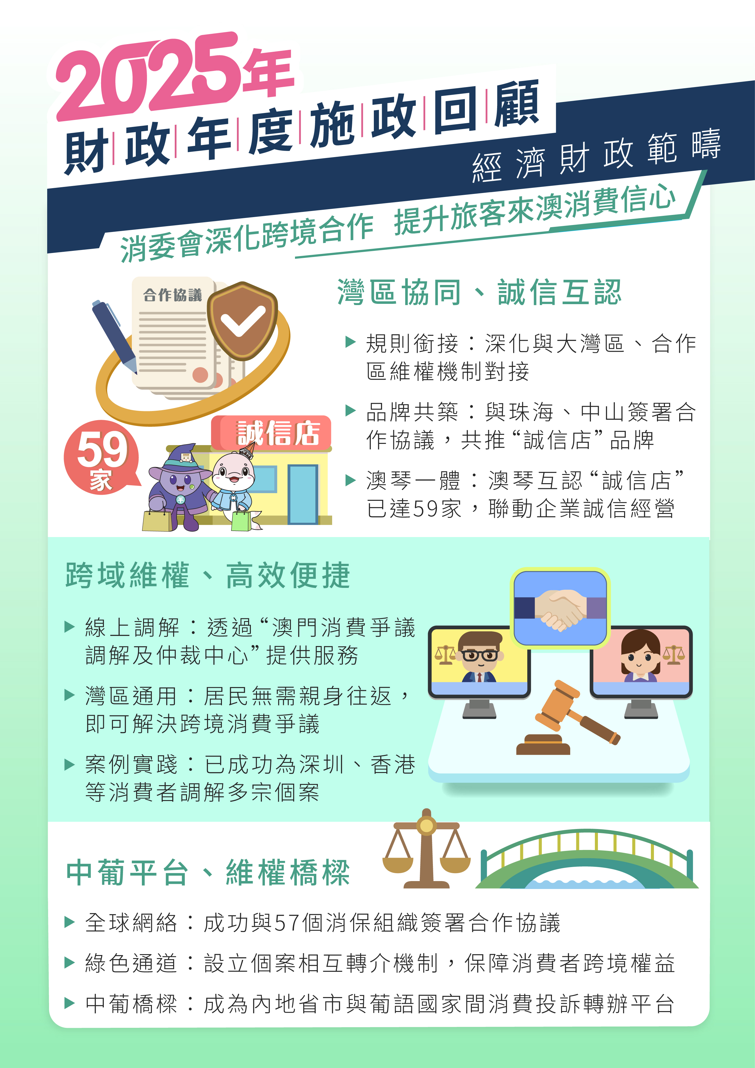 為落實2025年施政報告提出維護消費權益,深化區域消保合作的方針,澳門消費者委員會(下稱“澳門消委會”)積極加強與各地消費者組織合作,透過專業便捷的服務切實保障消費者合法權益,進一步提升旅客來澳消費的信心,助力澳門“世界旅遊休閒中心”建設,促進澳門經濟適度多元發展。