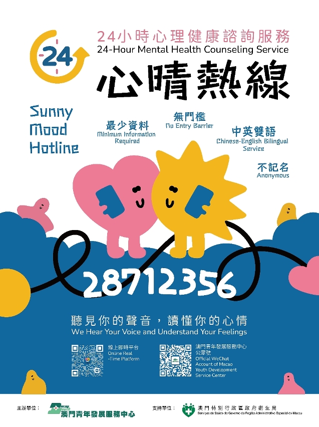 為積極推動“健康社區”計劃,貫徹“關口前移”、“資源下沉”、“觀念轉變”三大政策方向,廣泛聯動各界社團力量,發揮協同效應,由衛生局和澳門青年發展服務中心共同合作設立的“心晴熱線28712356”24小時心理健康諮詢服務早前舉行揭牌儀式。