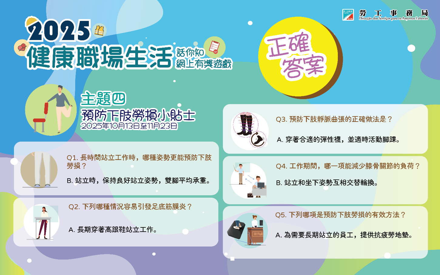 為持續提升市民的職業安全健康意識,加強對工作安全和健康的關注,勞工事務局(下稱“勞工局”)於本年6月至11月期間舉辦“健康職場生活話你知”系列有獎問答遊戲,四期活動共有逾兩萬人次參加。其中,第四期以“預防下肢勞損小貼士”為主題的問答遊戲已於11月23日結束。是次活動反應熱烈,共有5,265人次參加,當中有4,935人次答對全部問題。