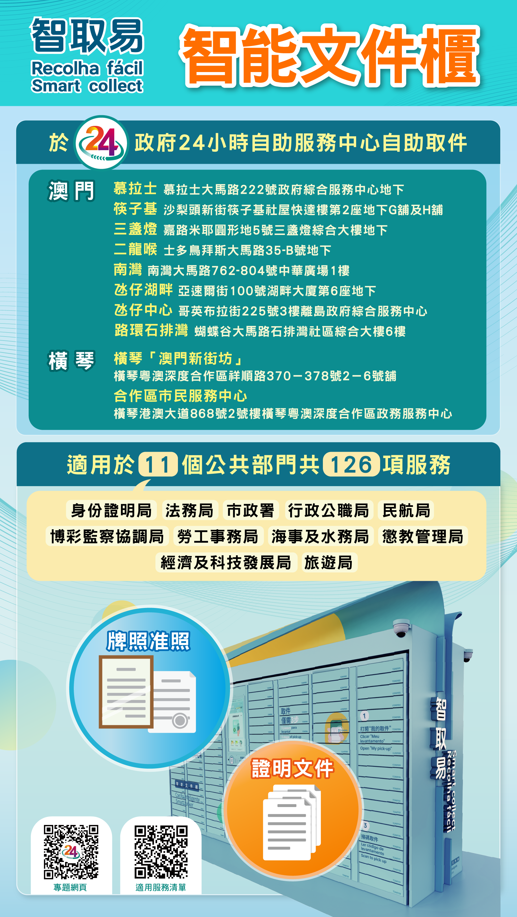 “智取易”智能文件櫃提供24小時自助取件服務,方便市民、商企和社團在申請政府文件後,於澳門和橫琴合作區各政府24小時自助服務中心的文件櫃取件,不受部門辦公時間限制。