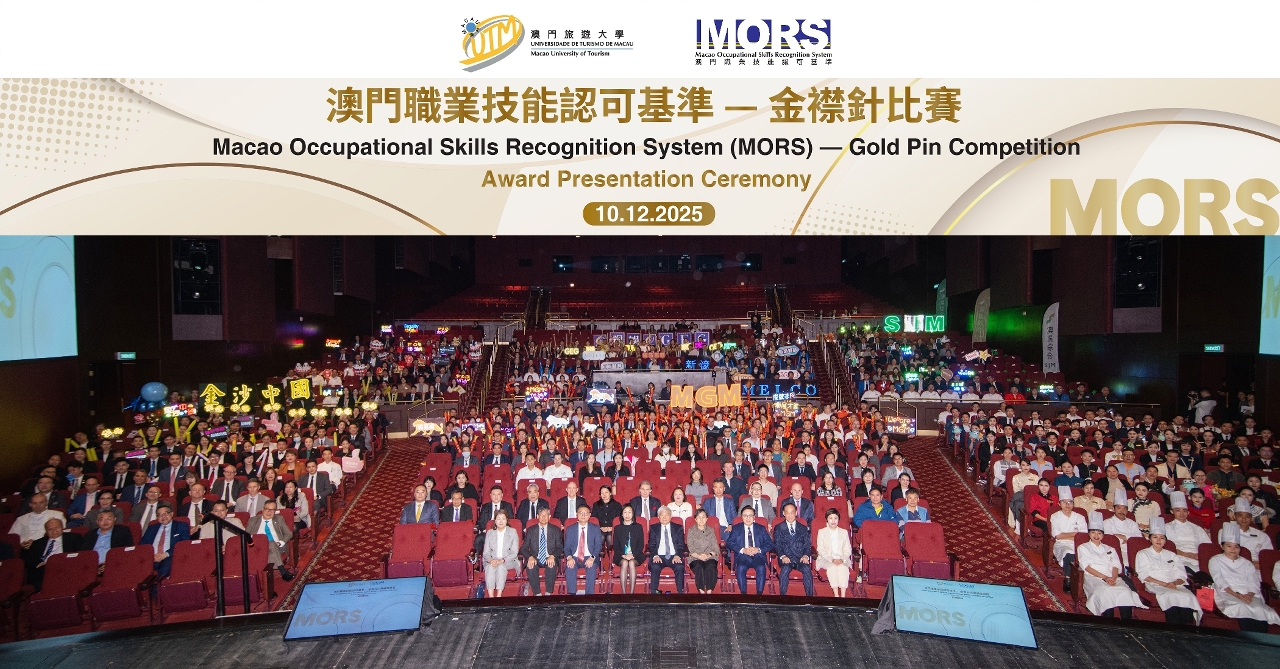 澳門旅遊大學於 2025 年 12 月 10 日舉行“澳門職業技能認可基準(MORS)”金襟針比賽頒獎典禮。出席嘉賓包括澳門旅遊大學校董會主席陳澤武、澳門旅遊大學校長黃竹君、澳門特區政府旅遊局局長文綺華、勞工事務局局長陳元童、金沙中國有限公司行政副主席王英偉、澳門酒店旅業職工會會長李寶來及澳門酒店協會理事長鍾友雄。