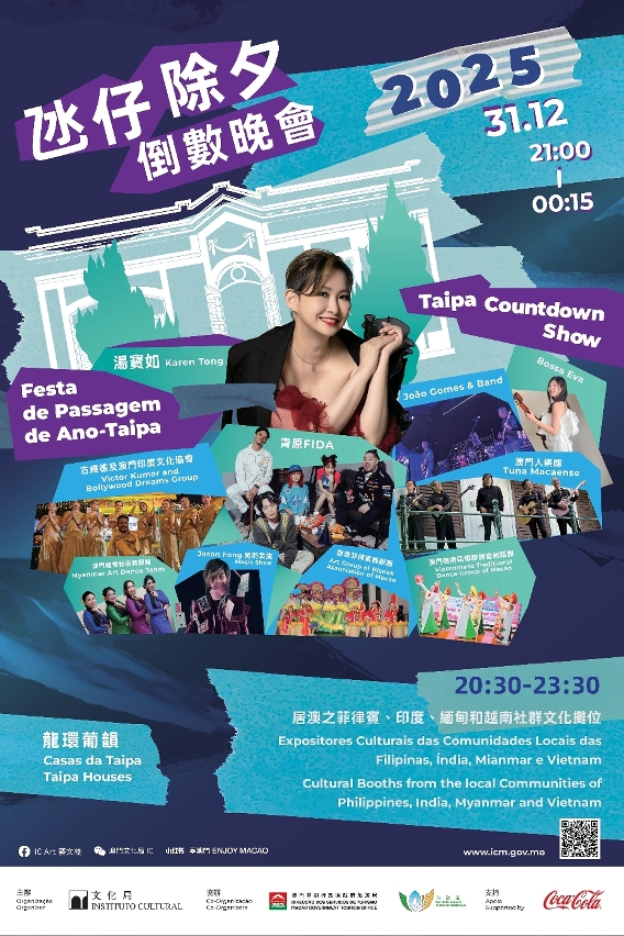 同晚,“2025氹仔除夕倒數晚會”將在龍環葡韻舉行,晚會以多元文化共融為主軸,邀請香港歌手湯寶如擔任壓軸演出嘉賓,並獻唱多首經典歌曲;本地音樂單位:青原、澳門人樂隊、Bossa Eva與João Gomes & Band亦將獻唱帶動現場氣氛。此外,一系列文化特色演出展現城市多元魅力,包括古維德及澳門印度文化協會、居澳菲律賓舞蹈團、緬甸藝團、越南藝團將分別帶來現代與傳統歌舞表演,以及魔術師馮兆恆表演魔術。晚上8時30分至11時30分,現場設有特色文化攤位,由居澳之菲律賓、印度、緬甸及越南社群展示當地傳統服飾、旅遊資訊、地道小食及飲品,彰顯澳門族群文化共融、和諧共處的都市生活氛圍。