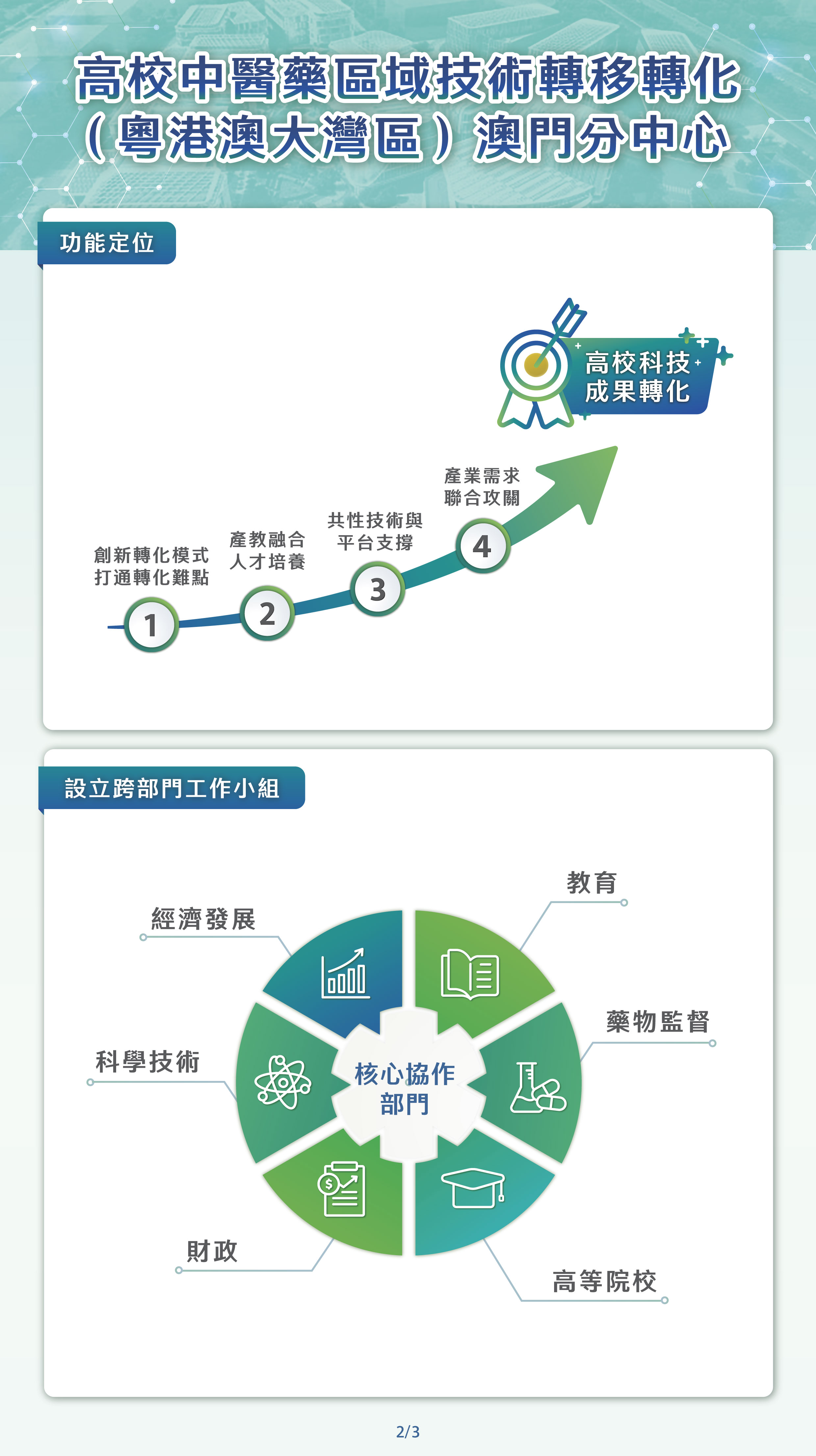 同時,回應國家教育部提出以“中心+節點”高校科技成果轉化體系的全國高校區域技術轉移轉化中心,加速創新成果的集聚與轉化,積極籌建高校中醫藥區域技術轉移轉化(粵港澳大灣區)澳門分中心,連結內地與澳門中醫藥頭部高校的科研團隊和企業,並善用澳門高校全國重點實驗室和合作區珠海澳大科技研究院等科技平台,建設服務與實驗平台,聯動政、產、學、研、金的力量,全力支援中醫藥大健康產業發展,實現科研成果從“書架走到貨架”,並以“澳門註册+横琴生產”模式,推動優質的中藥產品進入國際市場,全球銷售。