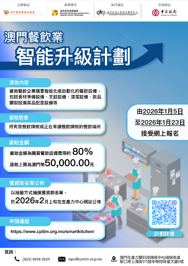 該計劃將於2026年1月5日至1月23日期間,接受本澳餐飲企業申請。申請者可根據自身營運需要,申請資助購置智能或自動化設備。資助金額為設備費用的八成,上限為50,000澳門元。有意申請的企業可先行聯絡供應商了解設備詳情,確認所需設備後,再透過線上系統提出申請。執行單位將對符合資格的申請名單進行抽籤,中籤名單將於2026年2月在生產力中心網站公佈。