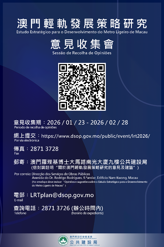 另外,2月1日及8日將舉行兩場公眾意見收集會,有意參加的市民,可透過專題網頁(https://www.dsop.gov.mo/public/event/lrt2026/)報名及下載路線藍圖介紹文本,亦可透過專題網頁填寫意見表,或以郵寄、傳真、電郵、電話等方式提出寶貴意見。如有疑問,可於辦公時間致電2871 3726查詢。