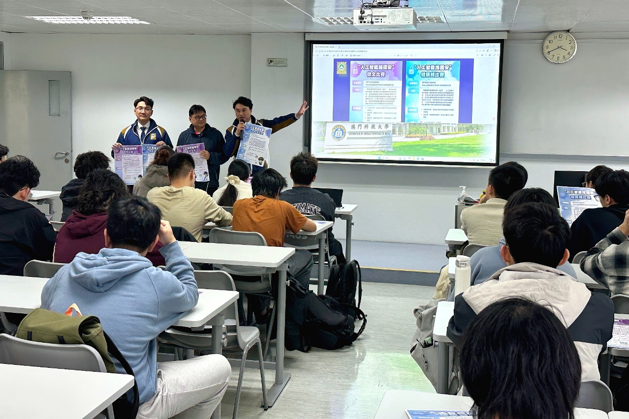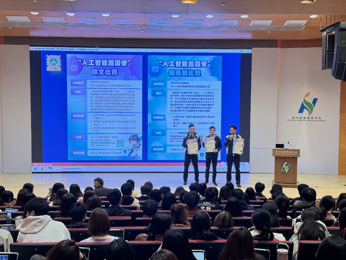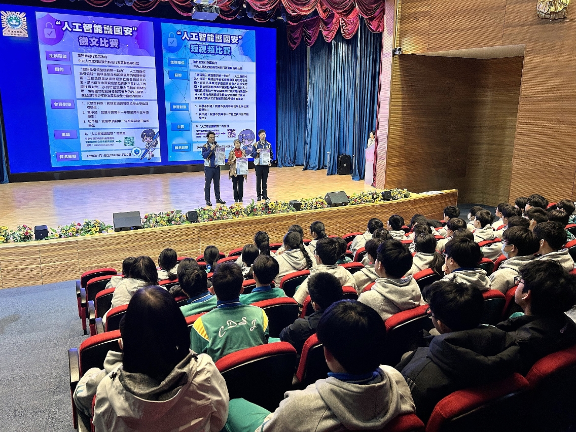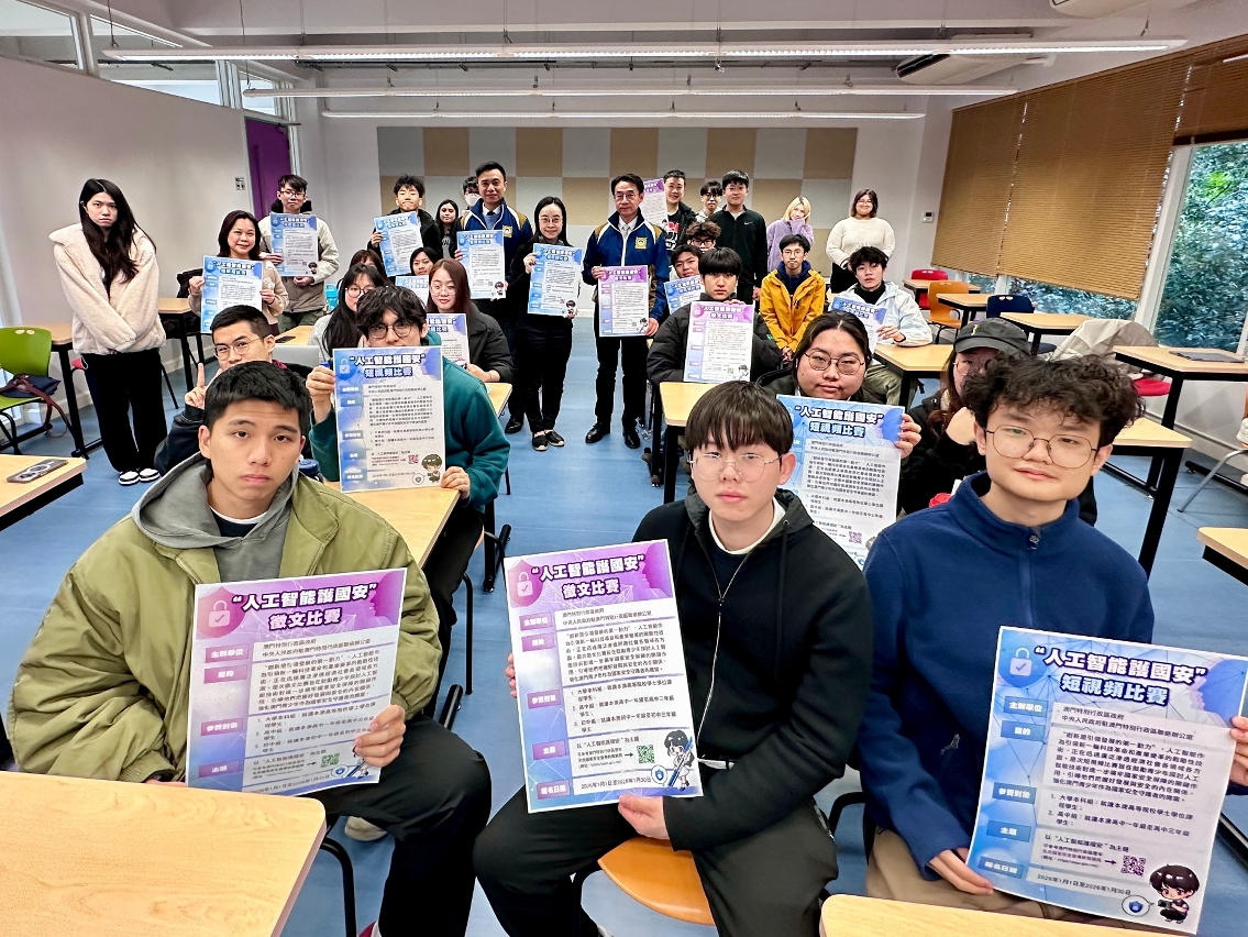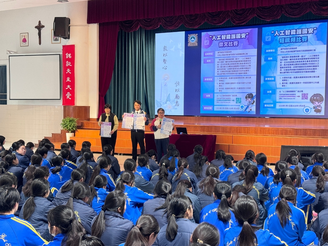 由澳門特別行政區政府與中央人民政府駐澳門特別行政區聯絡辦公室聯合舉辦的“人工智能護國安”徵文及短視頻比賽將於2026年1月30日截止遞交參賽作品,司法警察局由2025年12月上旬開始持續派員走訪本澳各高等院校及中學宣傳推廣相關比賽,來自多所本澳學校的學生踴躍報名參加。