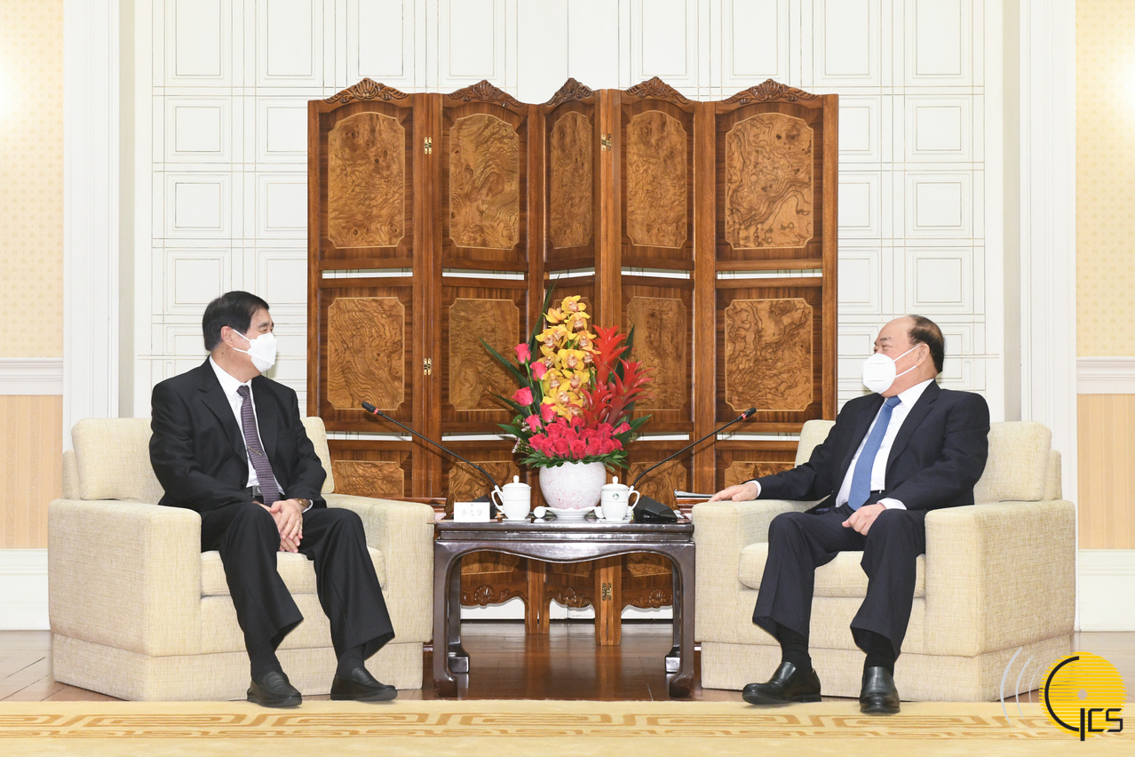 • The Chief Executive, Mr Ho Iat Seng, poses for a photo with member of the Standing Committee of the National People's Congress, party secretary and president of the All-China Federation of Taiwan Compatriots, Mr Huang Zhixian, during a meeting at the Government Headquarters.