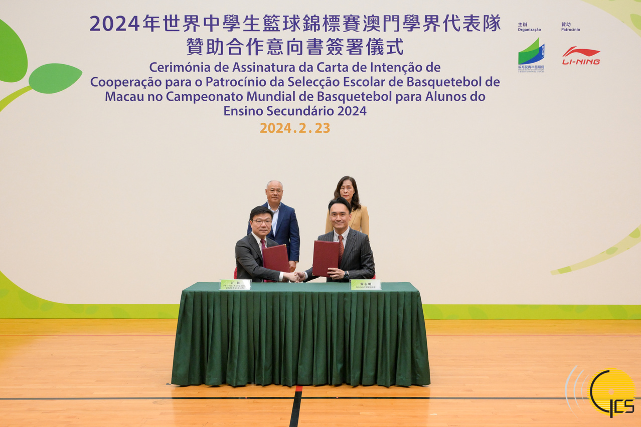 The Secretary for Social Affairs and Culture, Ms Ao Ieong U, witnesses the signing of the Letter of Intent for Sponsorship and Cooperation of the Macao Schools Team in the World School Basketball Championship 2024.