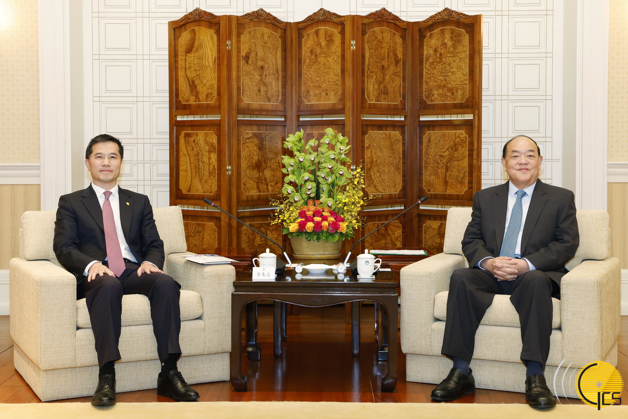 The Chief Executive, Mr Ho Iat Seng, meets with the Chairman of the Board of Directors of Luso International Banking, Mr Huang Laizhi, at the Government Headquarters.