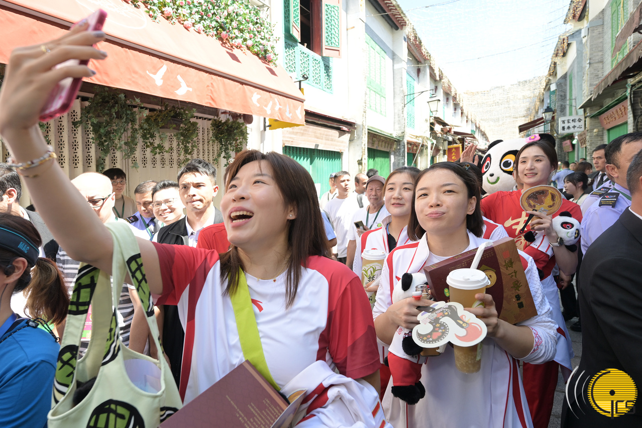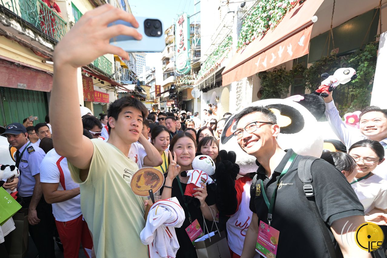 • A group photograph of national Olympic athletes at Rua da Felicidade pedestrian zone.