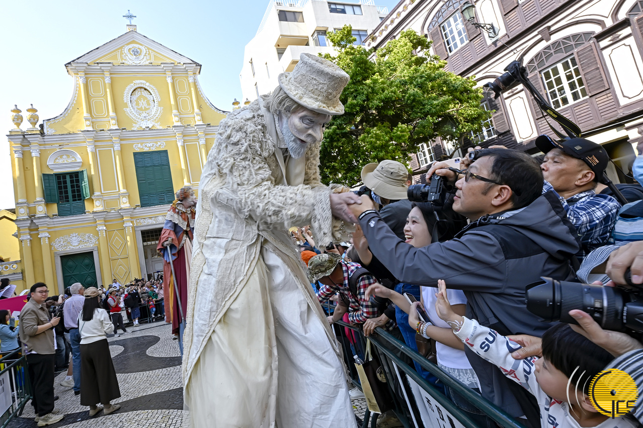 • The Parade procession began from the Ruins of St. Paul’s, passing along old streets and plazas in the Historic Centre of Macao, including Largo de S. Domingos. Pictured: onlookers get some closeup interaction with the performers.