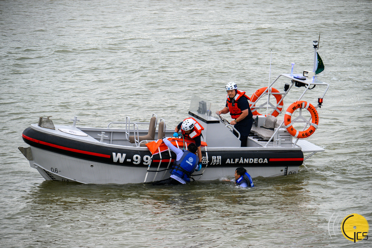 • "Crystal Fish 2025" civil protection drill – Macao Customs officers deploy a rescue speedboat to salvage two crew members from the sea.