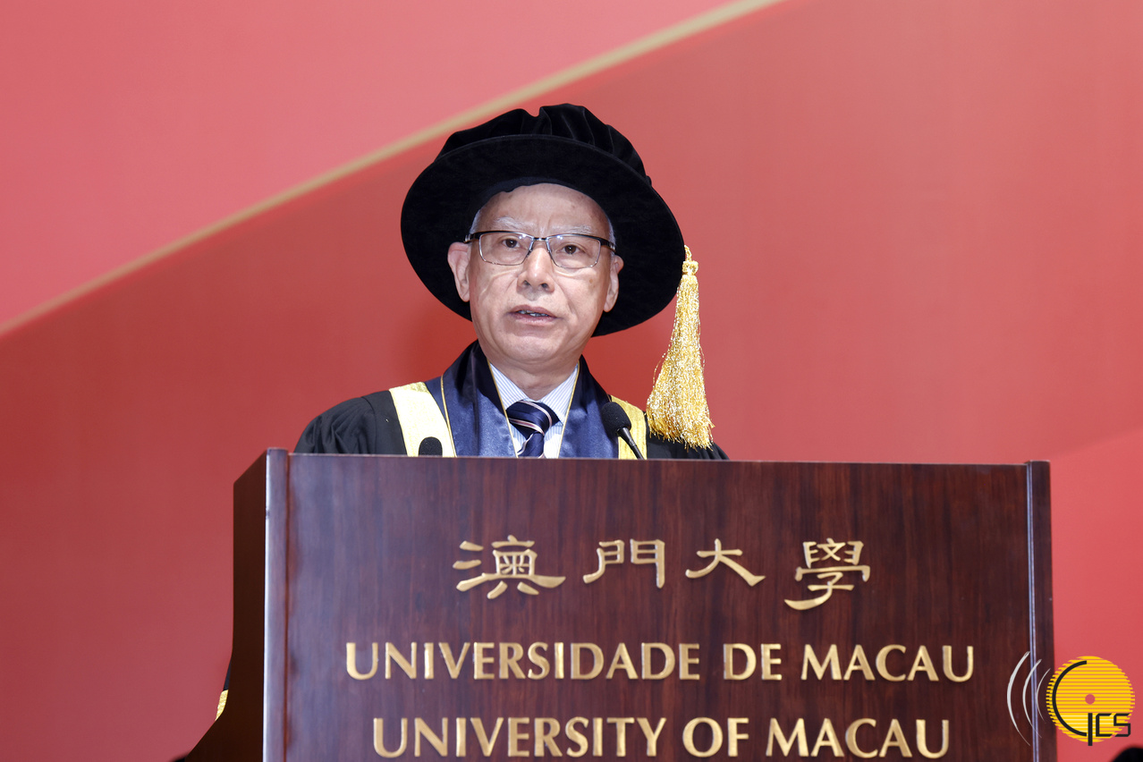 • The Chief Executive, Mr Sam Hou Fai, delivers a speech at the congregation 2025 of the University of Macau.