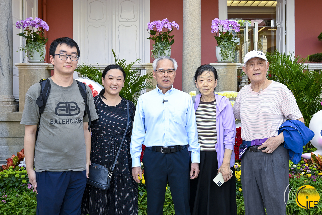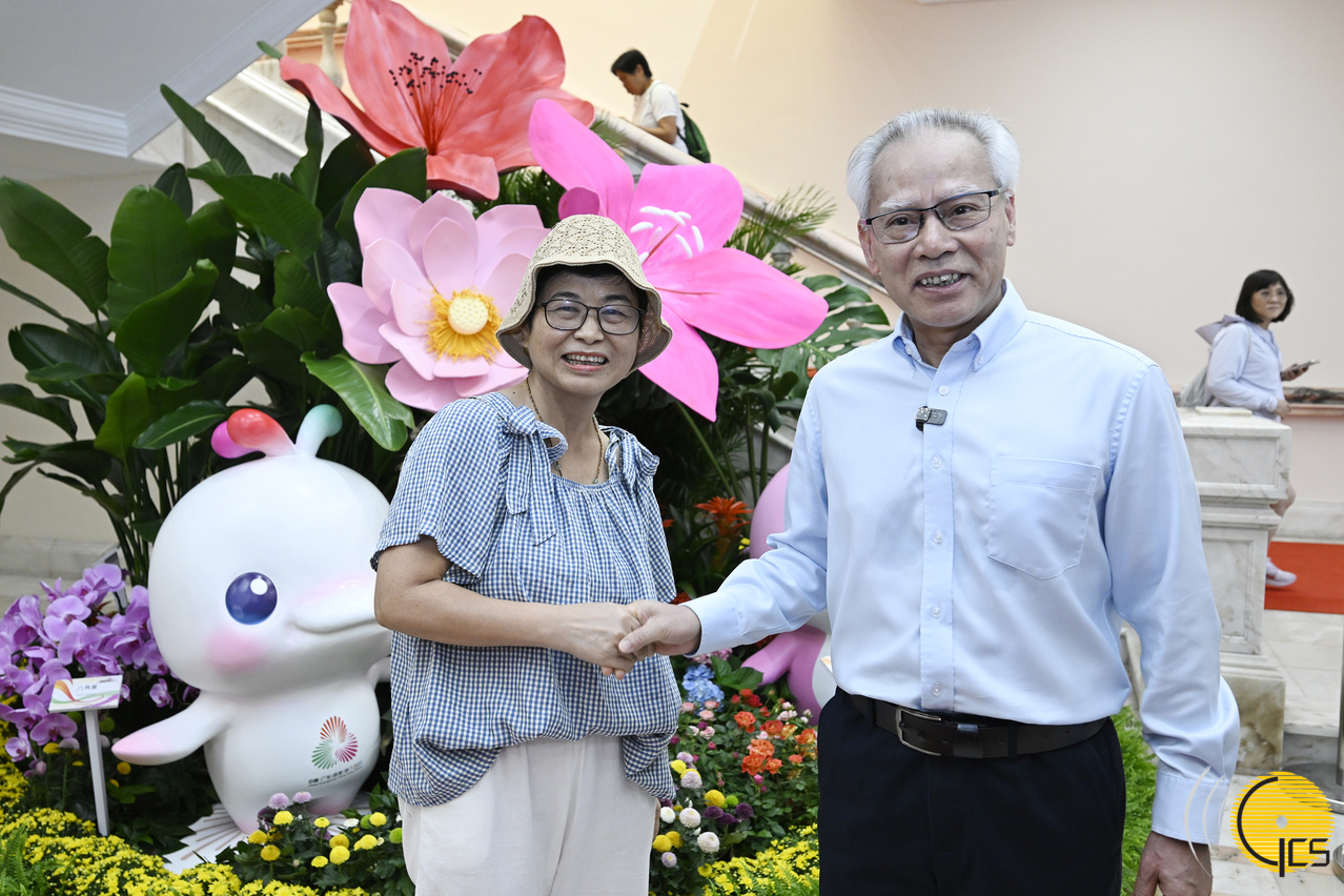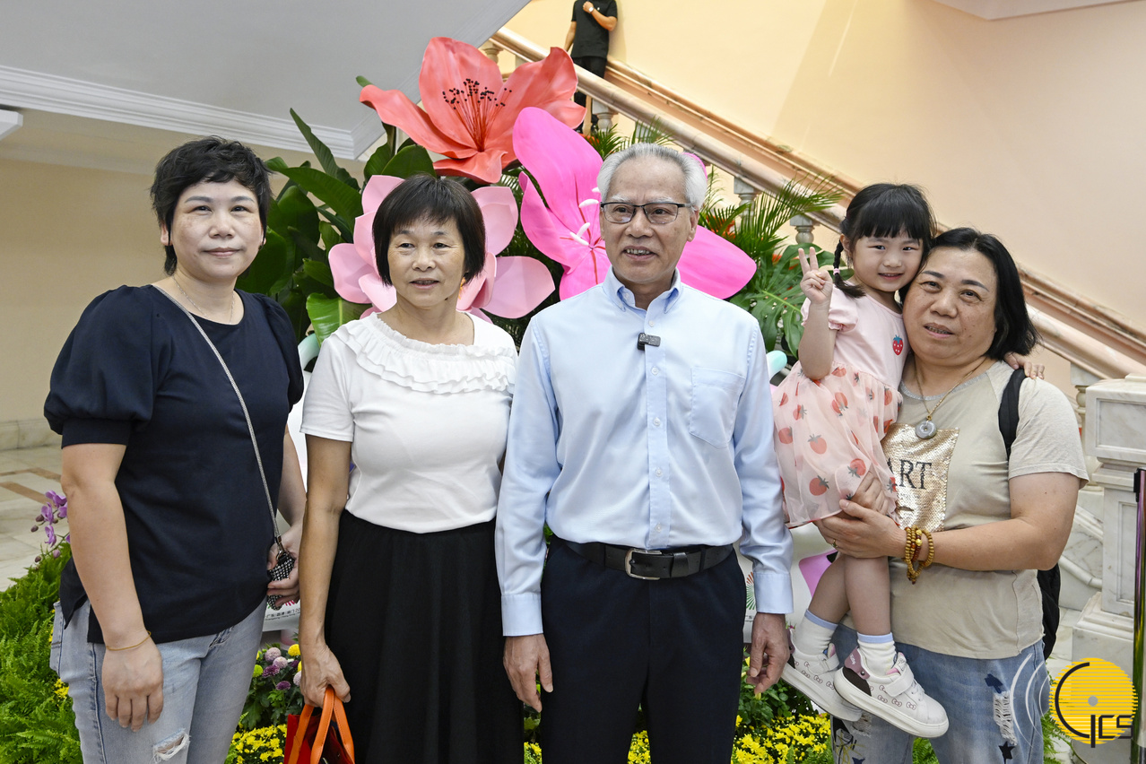 • The Chief Executive, Mr Sam Hou Fai, admires with visitors the floral arrangements, and pauses for a group photo against the backdrop of a sea of flowers.