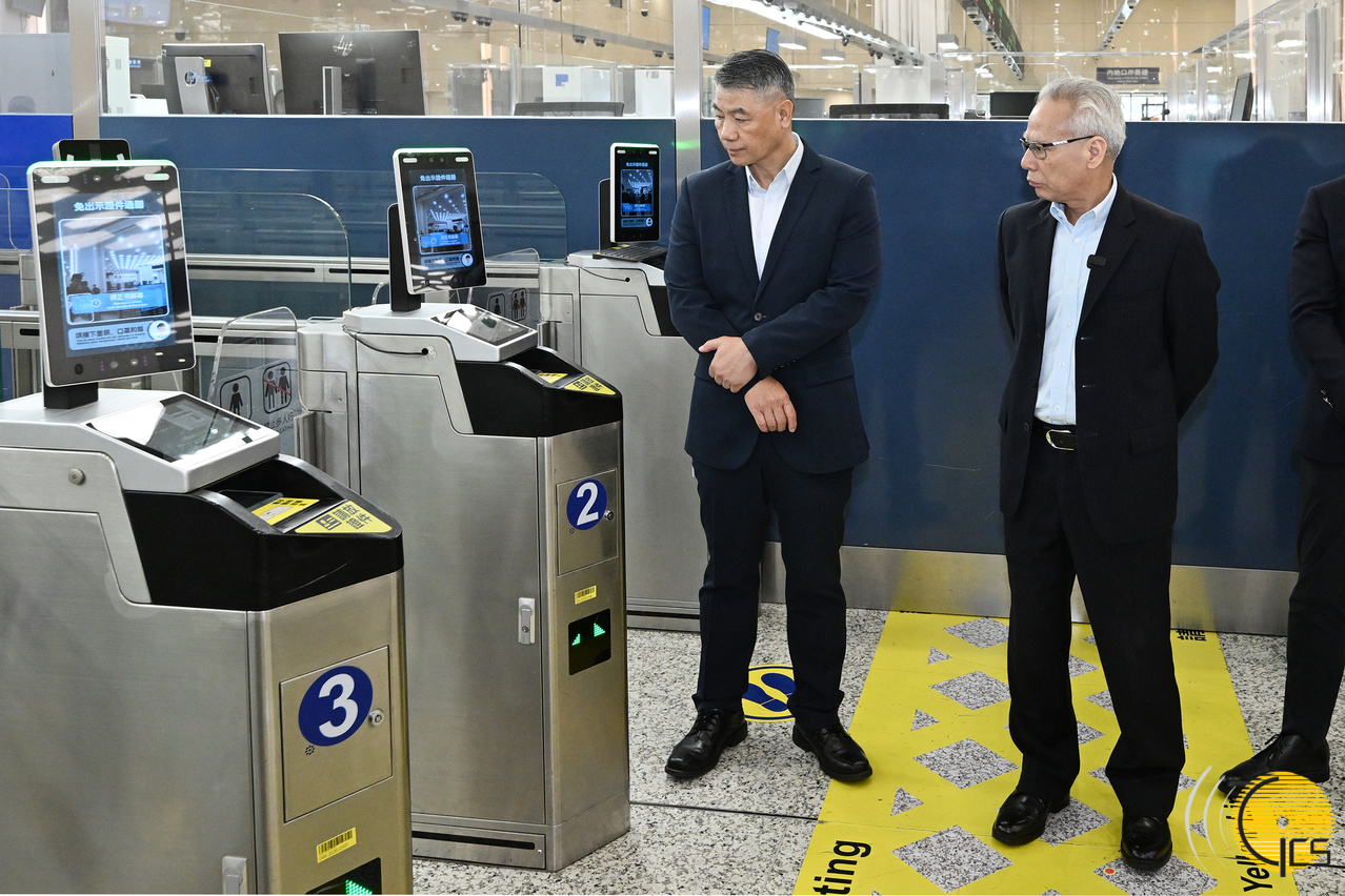 • The Chief Executive, Mr Sam Hou Fai, visits automated immigration lanes at the checkpoint, receiving briefings on the operation of the "face-scan" smart clearance system and the expansion of the lane facilities.