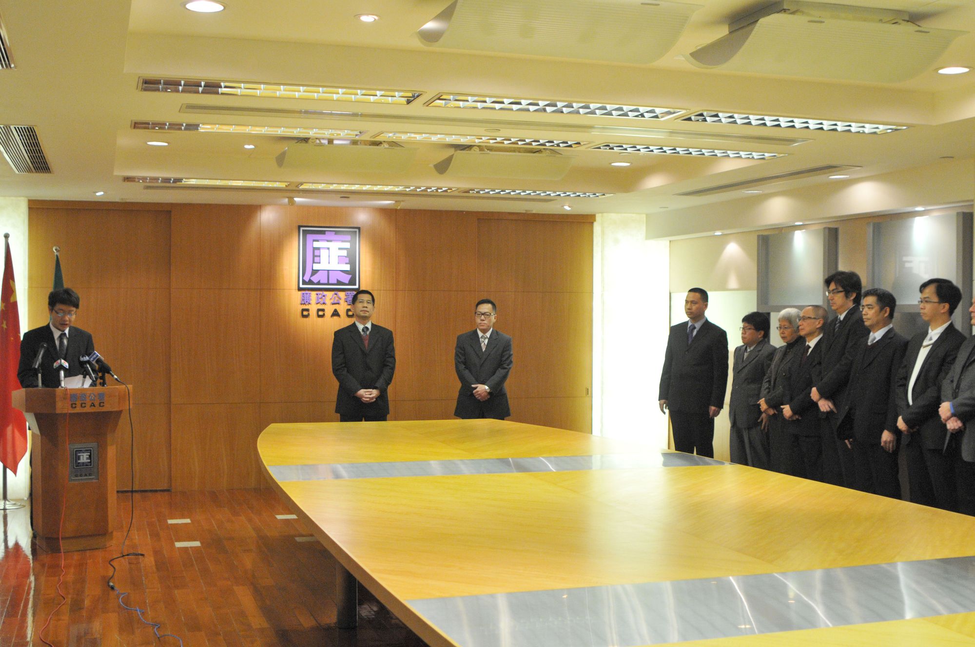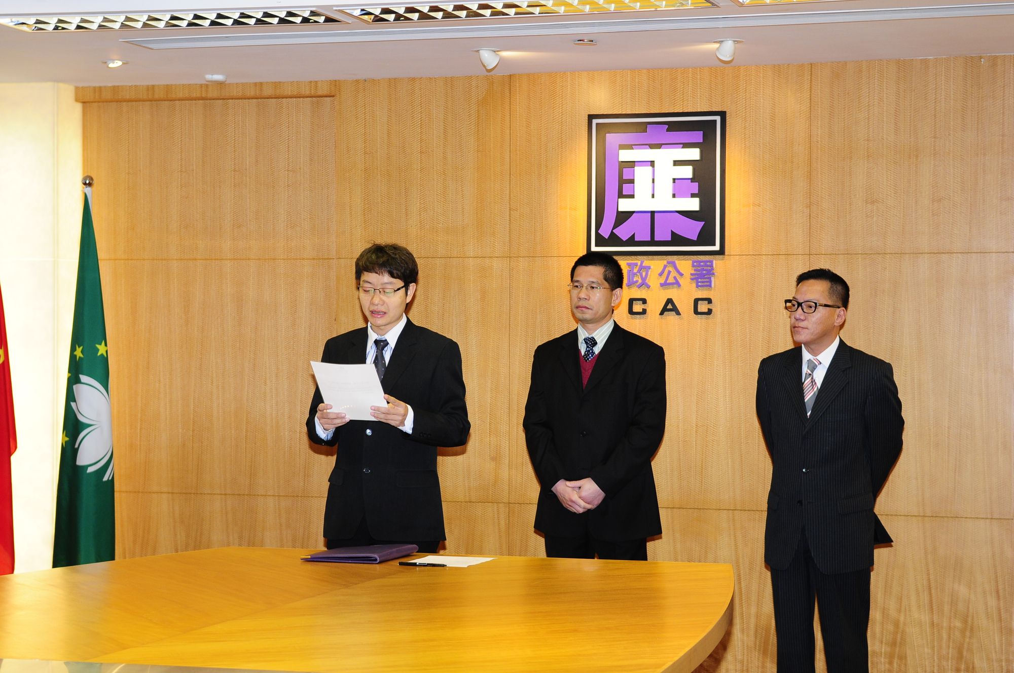 Administered by the Commissioner Against Corruption, Fong Man Chong, the swearing-in ceremony was held at the headquarter of the CCAC at 11:00am. Kuan Kun Hong swore in as the Deputy Commissioner Against Corruption in front of the members of the Monitoring Committee for the Discipline of the CCAC Personnel, lawyer Paula Ling and lawyer Philip Xavier, the Chief of Cabinet of the Prosecutor General, Lai Kin Ian, the Cabinet Coordinator of the Unitary Police Service, Chio U Man and the colleagues of the CCAC.