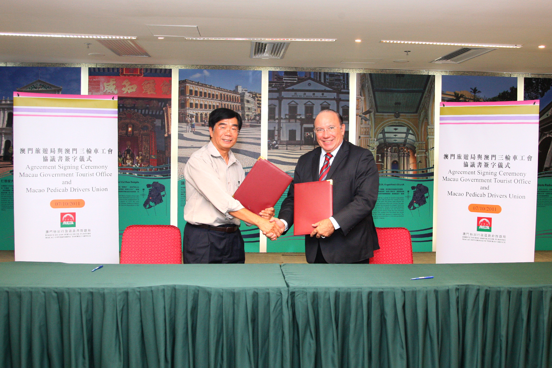 To highlight Macau’s cultural tourism resource and boost the diversification of the tourism industry, Macau Government Tourist Office and Macau Pedicab Drivers Union signed today (7th Oct) a cooperation agreement to promote pedicab service and enhance the image of the industry.