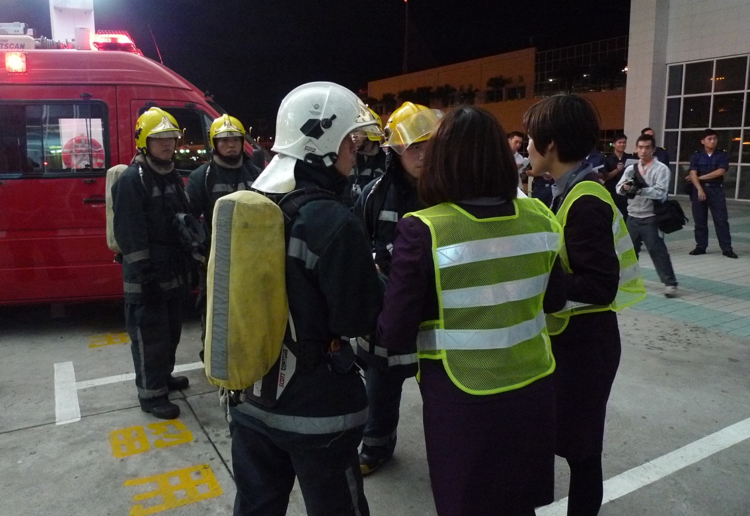 The safety exercise started at 23:30 with the participation of 80 people. It simulated the scenario of an accident with a helicopter carrying passengers. An engine failure occurred after the helicopter has taken off; the helicopter lost propulsive power and landed heavily back onto the pad. The accident resulted in the detachment of some parts from the aircraft and caused three injuries. The Flight Operation Control Centre immediately activated the emergency response procedures and notified all relevant entities. The Heliport Emergency Operation Centre was then activated. Representatives of the relevant entities and the rescue team arrived on site in a short time to handle the emergencies: rescuing the injured, evacuating the personnel, maintaining order in the terminal, attending to enquiries and so on. The whole exercise was concluded in an hour.