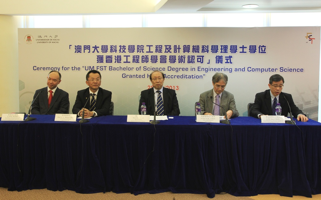Four bachelor degree programmes offered by the University of Macau’s (UM) Faculty of Science and Technology (FST), namely Bachelor of Science in Civil Engineering, Bachelor of Science in Computer Science, Bachelor of Science in Electrical and Computer Engineering, and Bachelor of Science in Electromechanical Engineering, received accreditation from the Hong Kong Institution of Engineers (HKIE). Students starting these four programmes in the 2011/2012 academic year are recognised under this accreditation, and upon graduation they will be qualified to become members of HKIE in order to receive professional qualifications recognised worldwide. This is the first time that Macao’s degree programmes have received accreditation from HKIE.