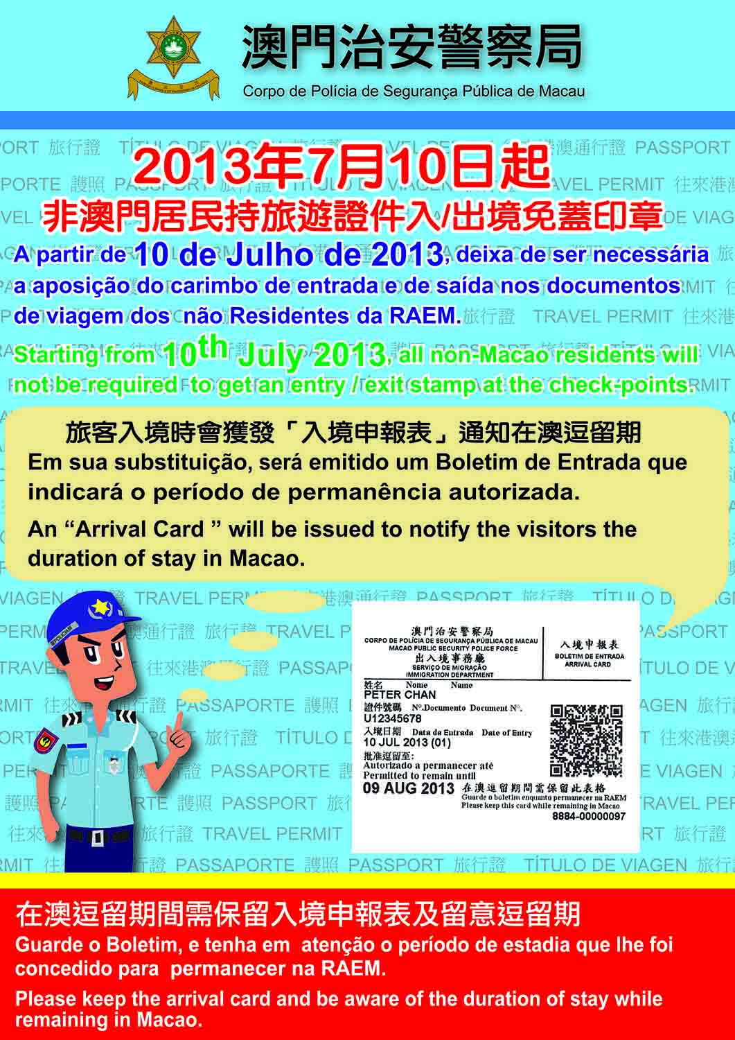 Non-stamping immigration clearance policy will be effective from 10th July, 2013. Travelers with visiting permits and passports will receive a printed arrival card at all border checkpoints of Macao instead of a stamp on the travel documents. There will also be no stamping upon departure.