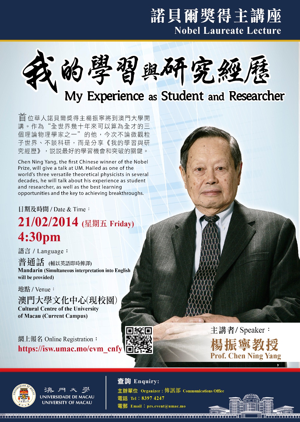 Prof. Yang’s talk will take place on Friday 21 February at 4:30pm at UM’s Cultural Centre on the current campus. The talk will be conducted in Mandarin, with simultaneous interpretation into English. For those interested, please apply on UM’s website https://isw.umac.mo/evm_cnfy. For enquiries, please call 83974247 or email to prs.event@umac.mo during office hours.