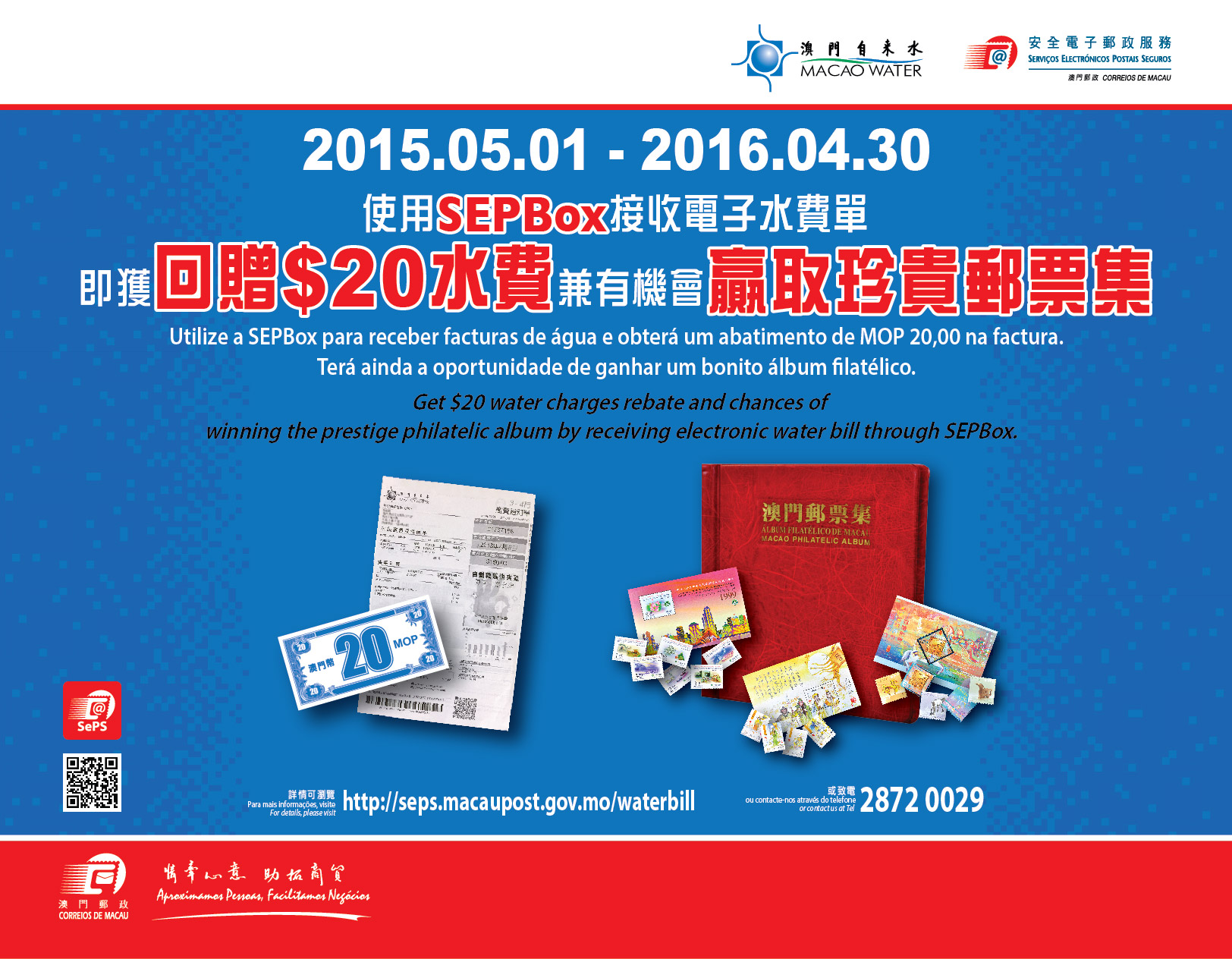 During the 1st May 2015 and the 30th April 2016, participants who successfully applied to receive Electronic Water Bill through “Secure Electronic Postal Box – SEPBox” will immediately get MOP$20 water charges rebate and eligible for lucky draws, and have chances of winning prestige philatelic album (A prestige stamp album collects one set of all stamps and souvenir sheets issued by Macao Post from the establishment of Macao Special Administrative Region to 2014), please visit http://seps.macaupost.gov.mo/waterbill for details.
