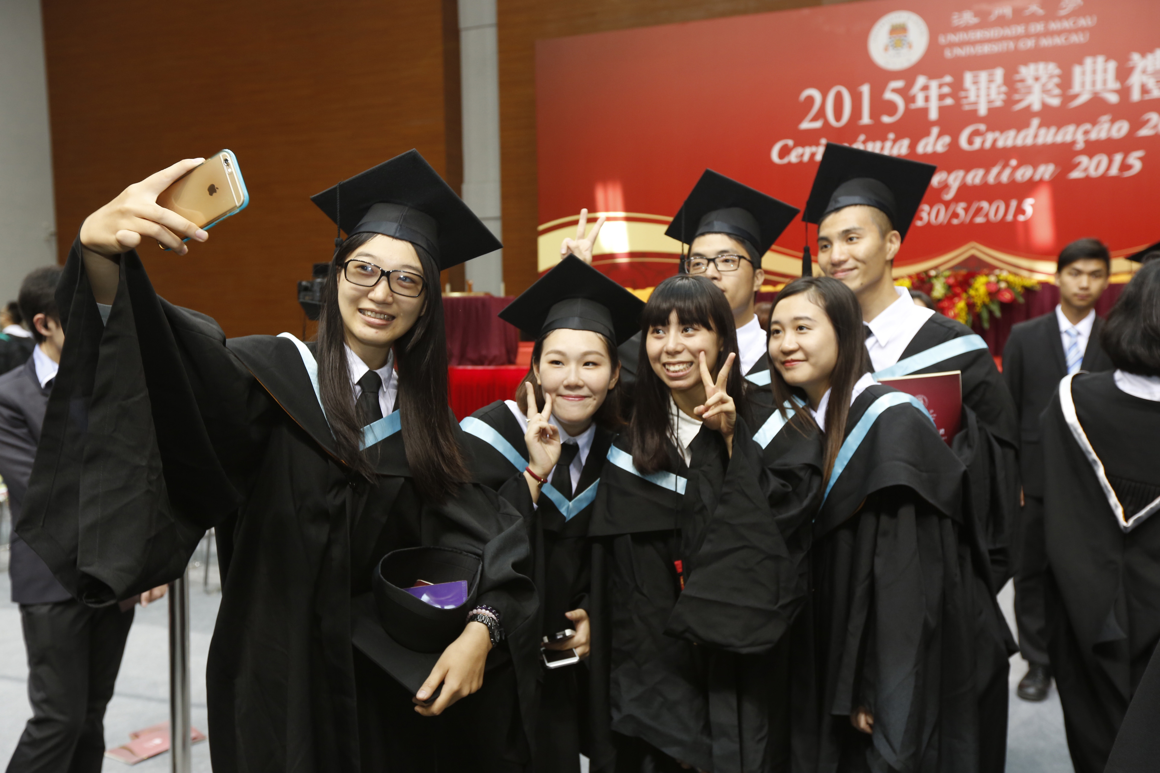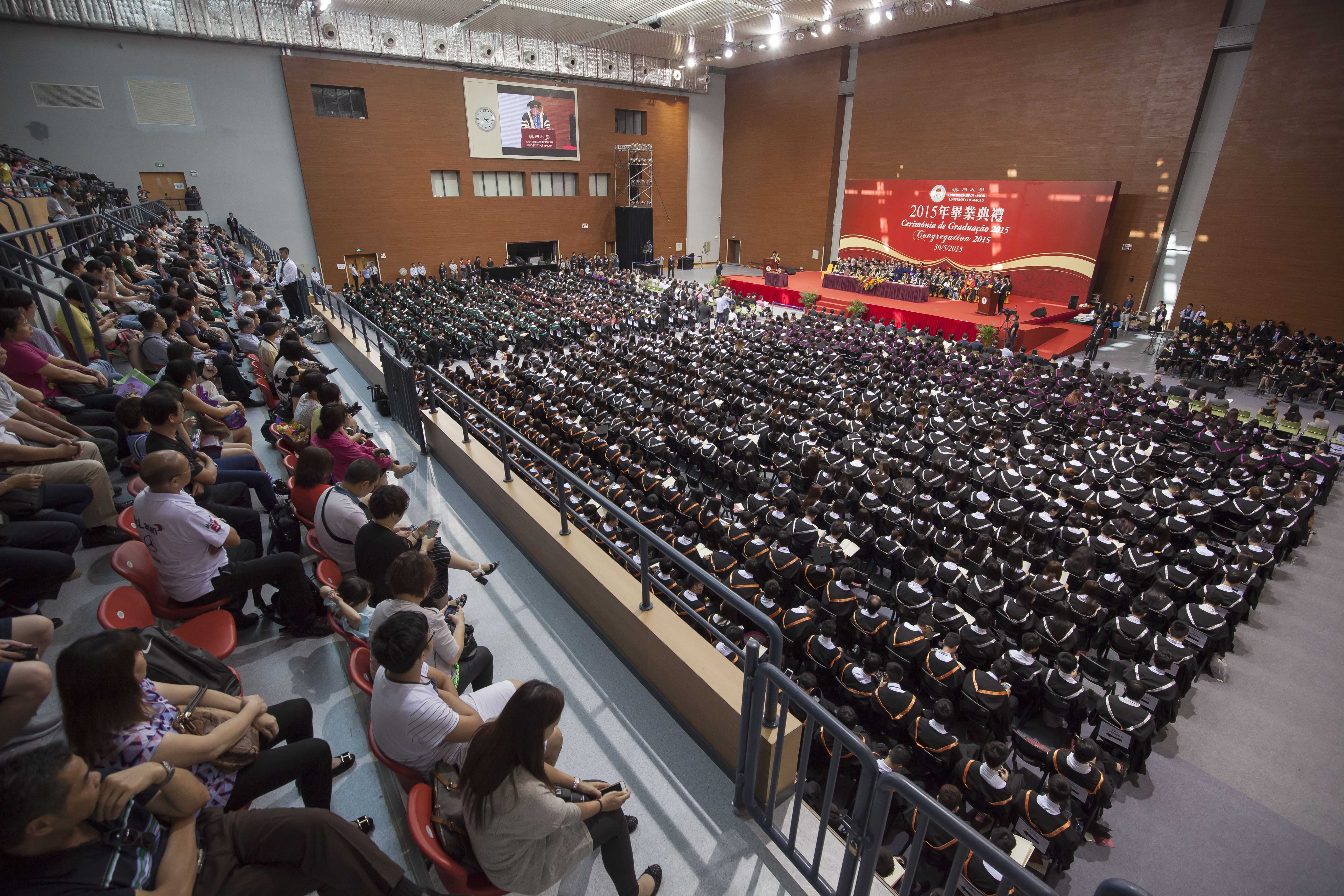 The University of Macau (UM) held the Congregation 2015 in its Sports Complex today (30 May) to present certificates to more than 1,000 graduating students. Chui Sai On, chief executive of the Macao SAR and chancellor of UM, noted at the ceremony that UM’s increasing international influence plays a positive role in promoting Macao’s image internationally, and he believes that UM will continue to occupy an important position on the higher education scene in Macao and make significant contributions to improving the overall quality of higher education in Macao.