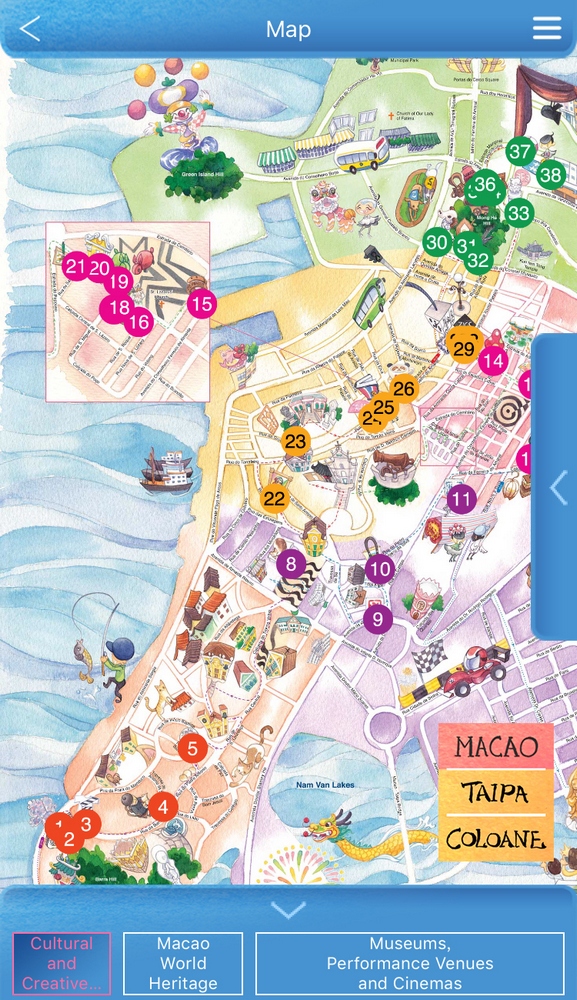 Apart from the information on Macao’s cultural and creative entities, the latest version of the CCM Map mobile app offers users details regarding the “Macao World Heritage” as well as information on “Museums, Performance Venues and Cinemas”. Users may look through the information, images and locations of the above mentioned entities or places of interest. The newly included section “Tour Routes” is divided into “A Stroll in the Parish” and “Tour Routes for the Experience of Culture and Creativity”. Providing informative travelling references, the routes connect a variety of local cultural and creative venues and World Heritage Sites, guiding users across the city for a subtle taste of art and culture.