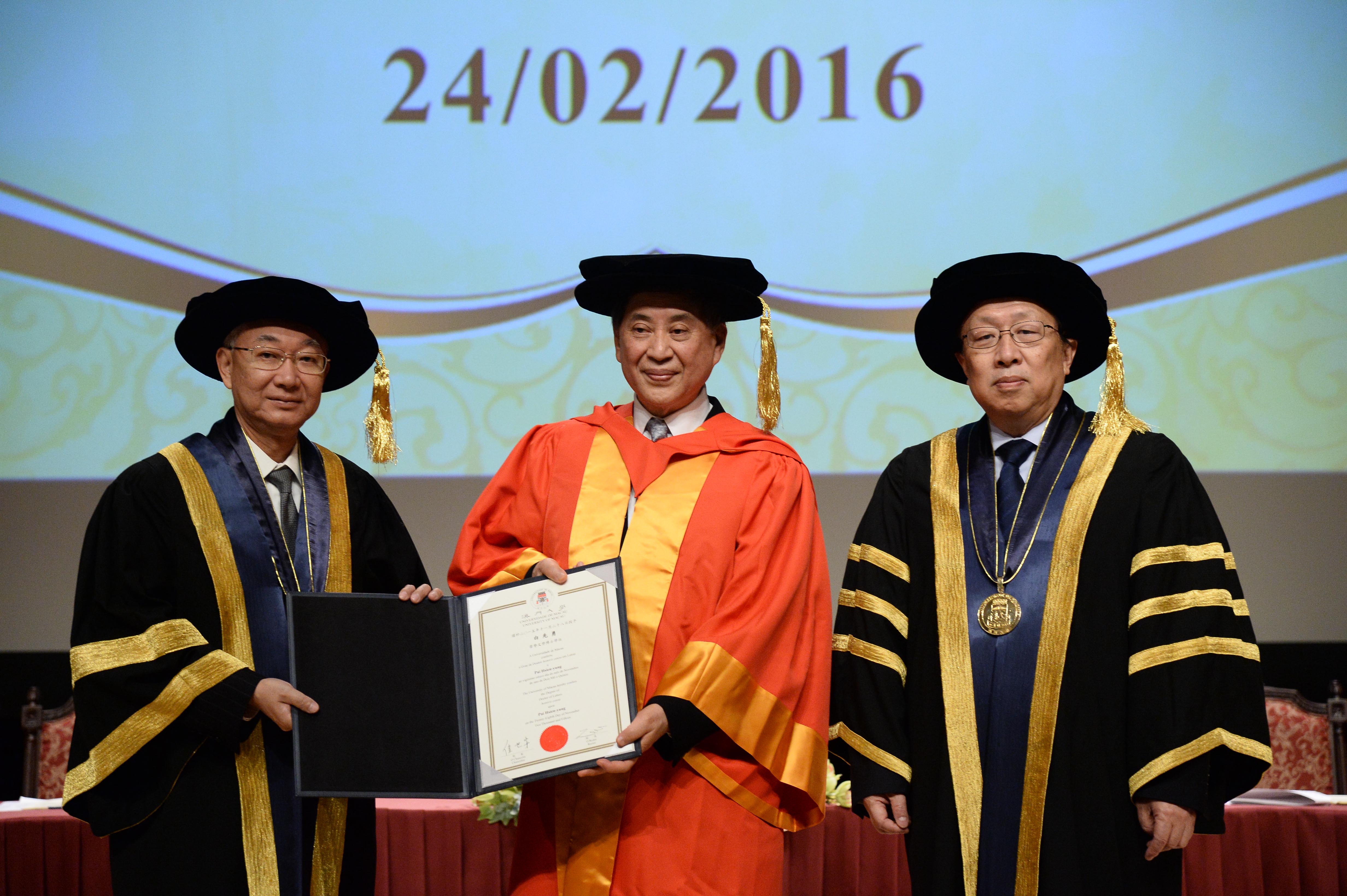 Prof Pai Hsien-yung, one of the foremost figures of Chinese literature, today (24 February) was conferred the Doctor of Letters honoris causa degree by the University of Macau (UM), in recognition of his significant contributions to world literature and the art of Kun opera. The degree conferment ceremony, held in the University Hall, was attended by a full-house audience consisting of literature lovers from around the world, prominent members from different fields, and UM faculty and students.
