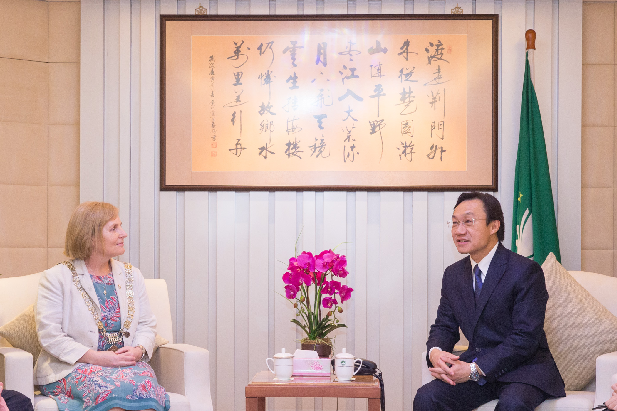 The Secretary for Social Affairs and Culture, Mr Tam Chon Weng, met the Lord Mayor of Dublin, Ms Críona Ní Dhálaigh, and the Consul General of Ireland to Hong Kong and Macao, Mr Peter Ryan, on Monday (21 March). The parties exchanged views on how to strengthen bilateral cooperation in several areas, including culture, education and sports.