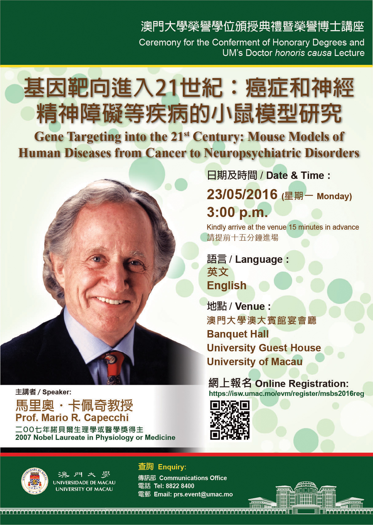 The talk will start on Monday 23 May at the Banquet Hall in the University Guest House. It will be conducted in English. For registrations, please visit https://isw.umac.mo/evm/register/msbs2016reg. For enquiries, please call 8822 4228/ 8822 4998 or email to fhs@umac.mo.