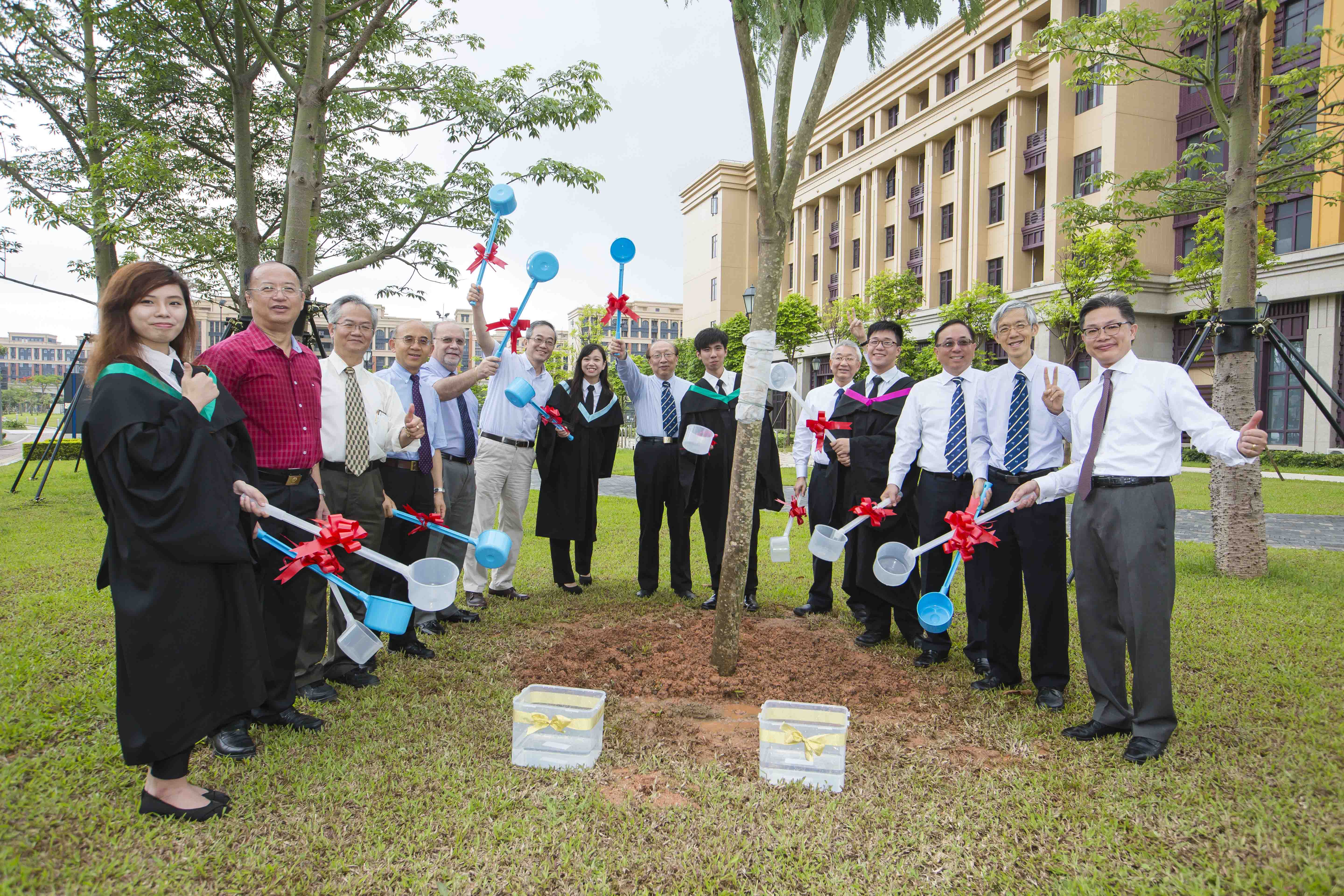 The University of Macau’s (UM) Class of 2016 today (28 May) planted a jacaranda tree on the Alumni Avenue on the campus, to express their gratitude to the alma mater. On the same day, the UM (Hong Kong) Alumni Association presented an inscribed stone tablet to the university, in an effort to encourage students to read.
