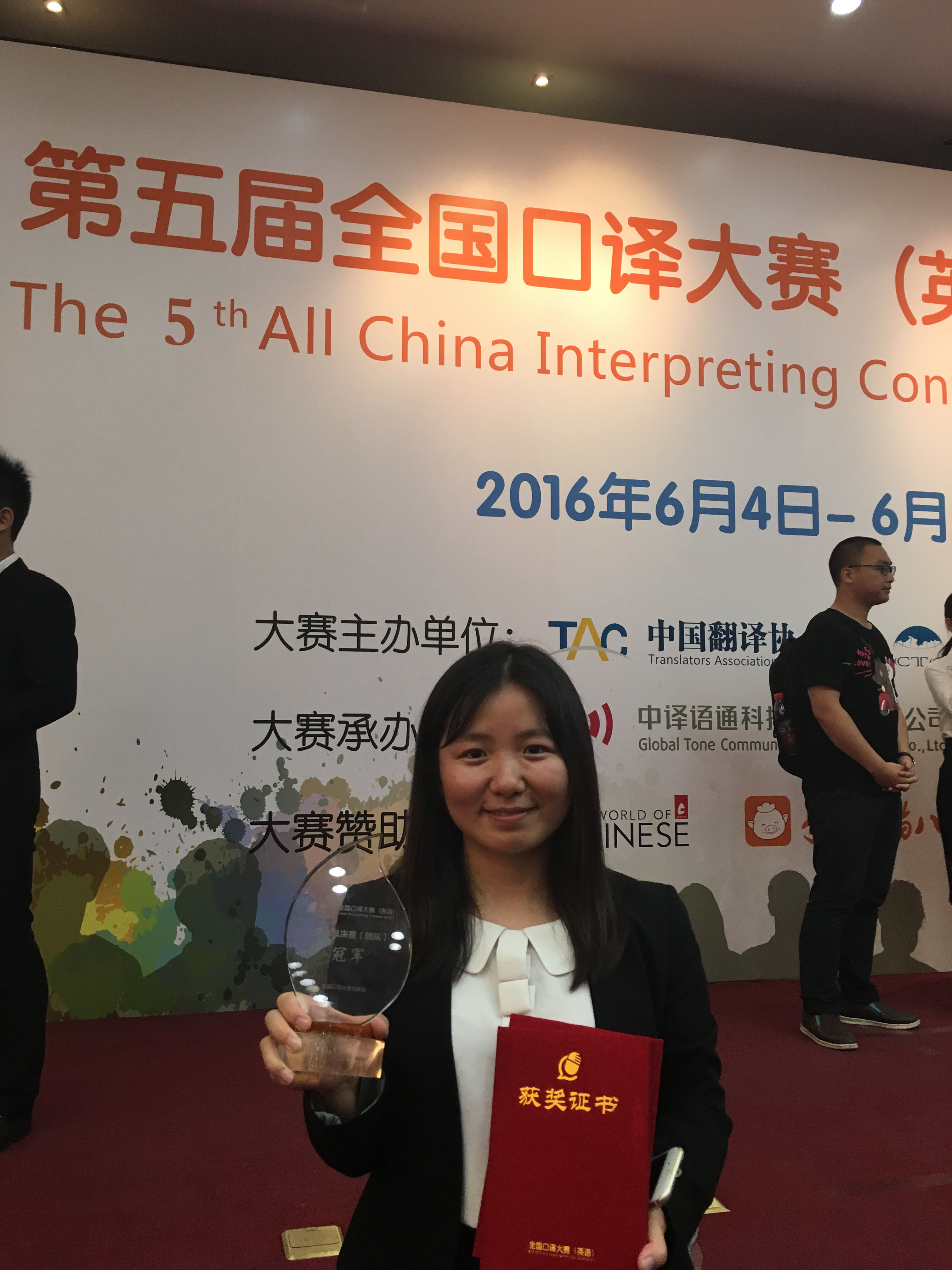 In the face of strong opponents from leading universities who have made it to the national final in Beijing through preliminaries, provincial contests, and regional contests, Zhang Xiaoping demonstrated an excellent command of both English and Chinese, outstanding skills in simultaneous interpreting, and a strong mind in the competition and won a second prize in the simultaneous interpreting invitational tournament. In the group category of consecutive interpreting, Yang Shanshan received the highest score in the ‘sodoku’ interpreting round. With solid interpreting and leadership skills and adaptability, she won the championship together with the two other contestants in her team, one from the Hong Kong Polytechnic University and the other from the Macao Polytechnic Institute.