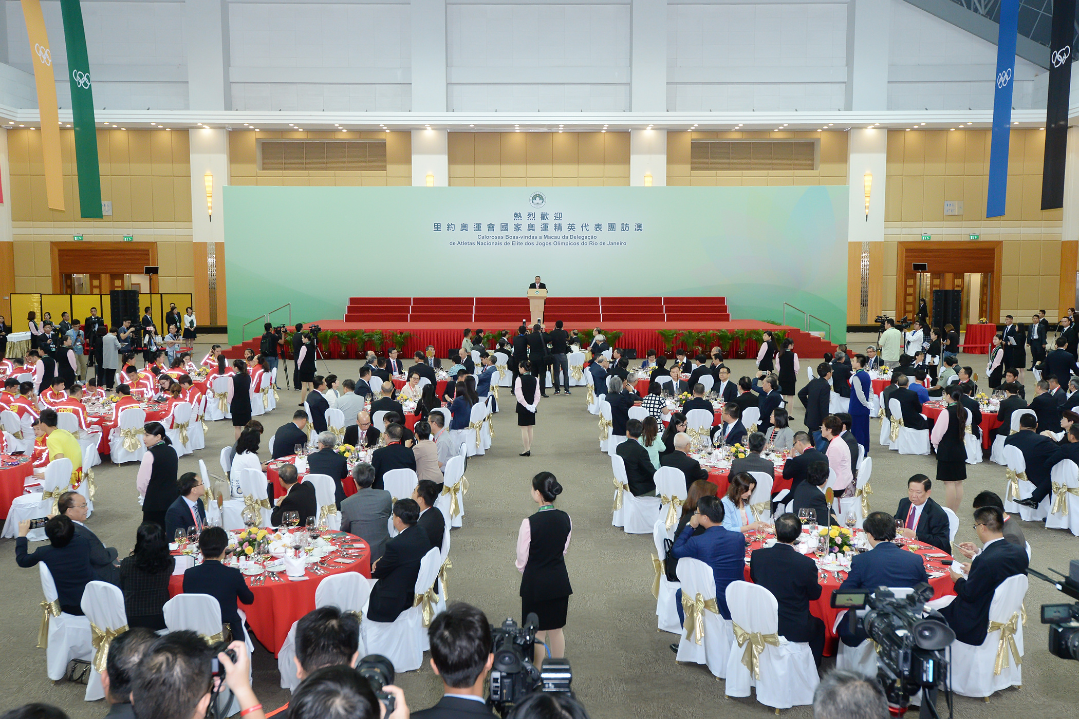 A total of 250 guests attended the welcoming banquet, including: the Director of the Liaison Office of the Central People’s Government in the Macao SAR, Mr Wang Zhimin; the Commissioner of the Office of the Commissioner of the Ministry of Foreign Affairs of the People’s Republic of China in the Macao SAR, Mr Ye Dabo; the Commander of the People's Liberation Army Macao Garrison, Major General Wang Wen; principal officials of the Macao Government; members of the Executive Council; members of the Legislative Assembly; Macao’s delegates respectively to the National People’s Congress and to the Chinese People’s Political Consultative Conference; members of the Sports Council and people from all walks of life.