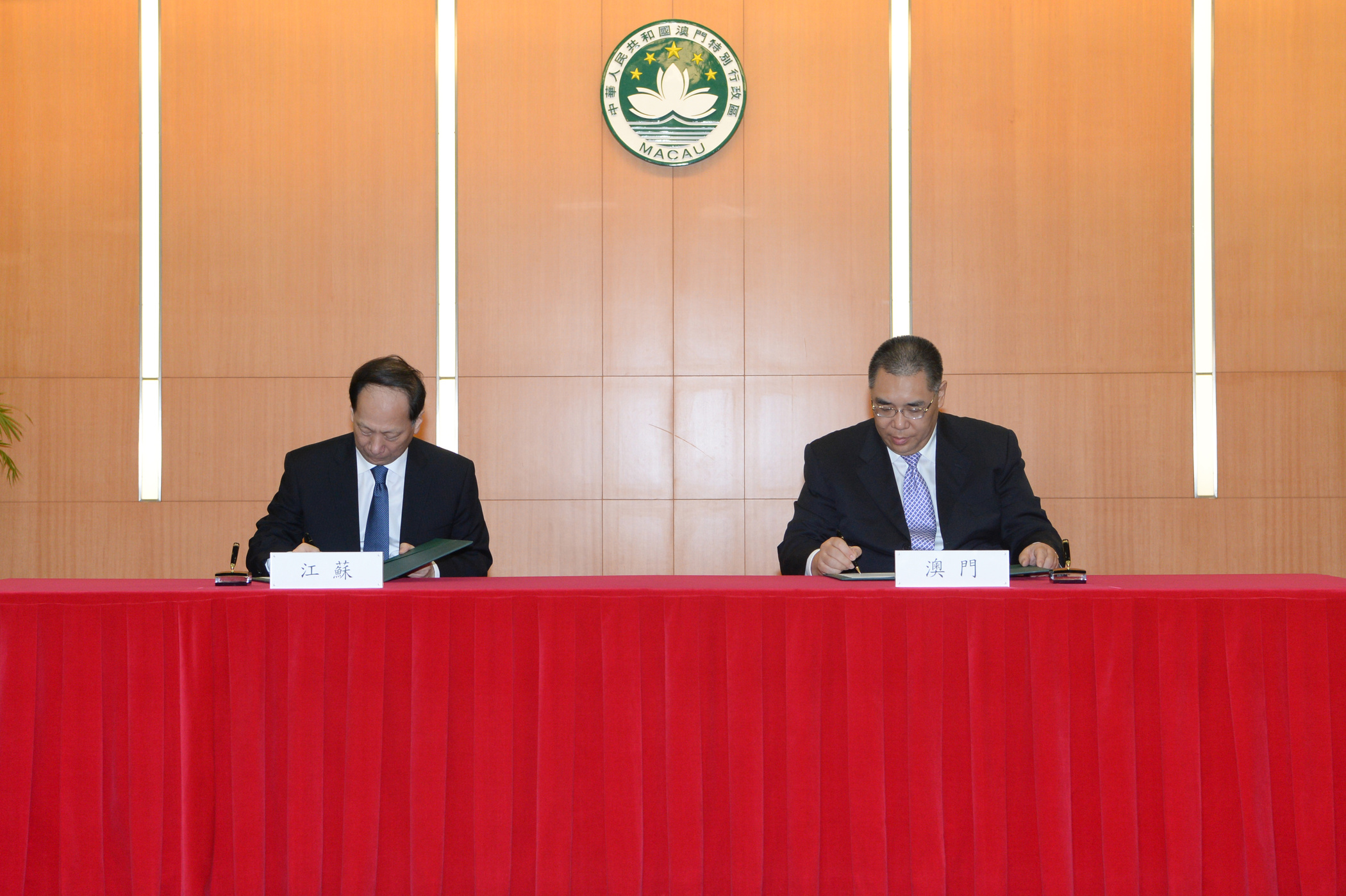 The memorandum of understanding between the Jiangsu Provincial People's Government and the Government of the Macao Special Administrative Region on building the Jiangsu-Macao Cooperation Park, was signed in Macao by the Chief Executive, Mr Chui Sai On, and the Governor of Jiangsu Province, Mr Shi Taifeng.