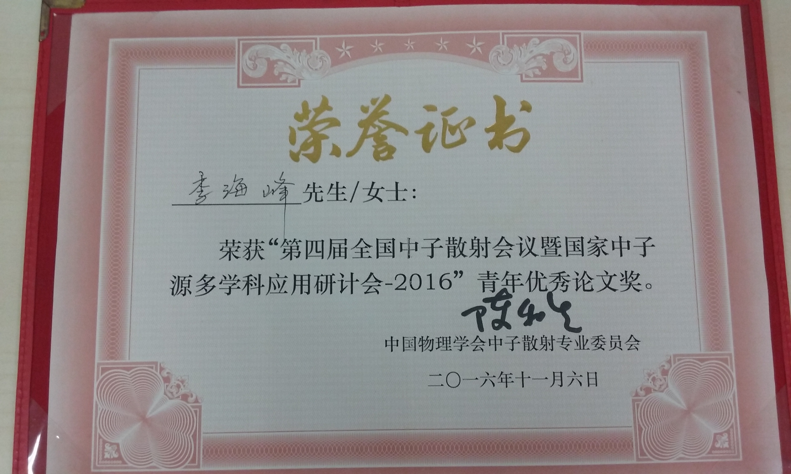 The conference was co-organised by the Special Committee on Neutron Scattering of the Chinese Physical Society, the China Spallation Neutron Source, the China Institute of Atomic Energy, and the Research Institute of Nuclear Physics and Chemistry under the China Academy of Engineering Physics. It was co-hosted by the China Spallation Neutron Source and the Southern University of Science and Technology. Approximately 200 research scientists from more than 20 universities and research institutes attended the conference to discuss neutron scattering, neutron diffraction, scattering technologies, and other related issues. 56 academic reports were presented at the conference. Prof Li is one of the two recipients of the 2016 Outstanding Youth Paper Award.