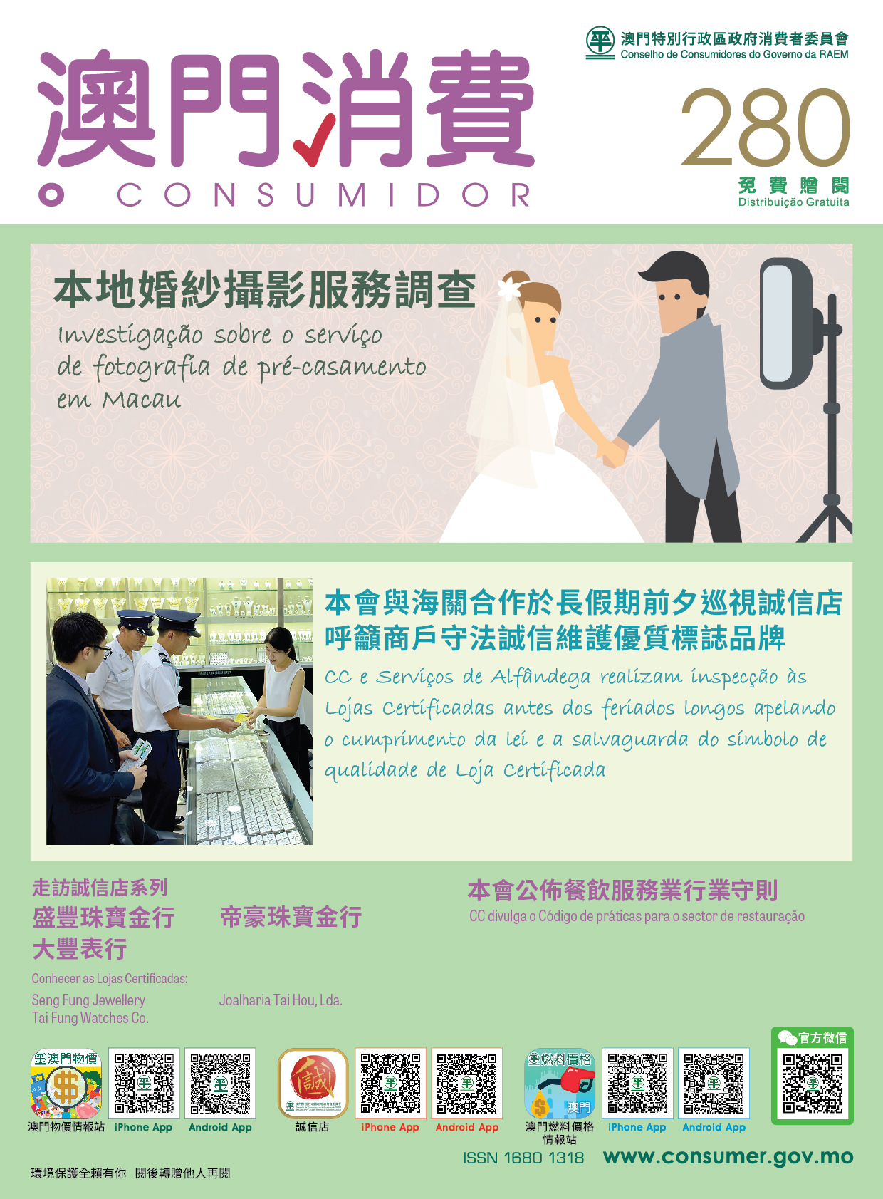 Consumer Report is now available free of charge at the Council (Av. Horta e Costa, N.º 26, Edf. Clementina Ho), and the service counter of the Council at Macao SAR Government Service Centre (Rua Nova da Areia Preta, Nº52), Public Information Centre at Vicky Plaza, libraries, and bookstores. Consumers may also access the magazine online on the Council’s official website (http://www.consumer.gov.mo) and WeChat official account.